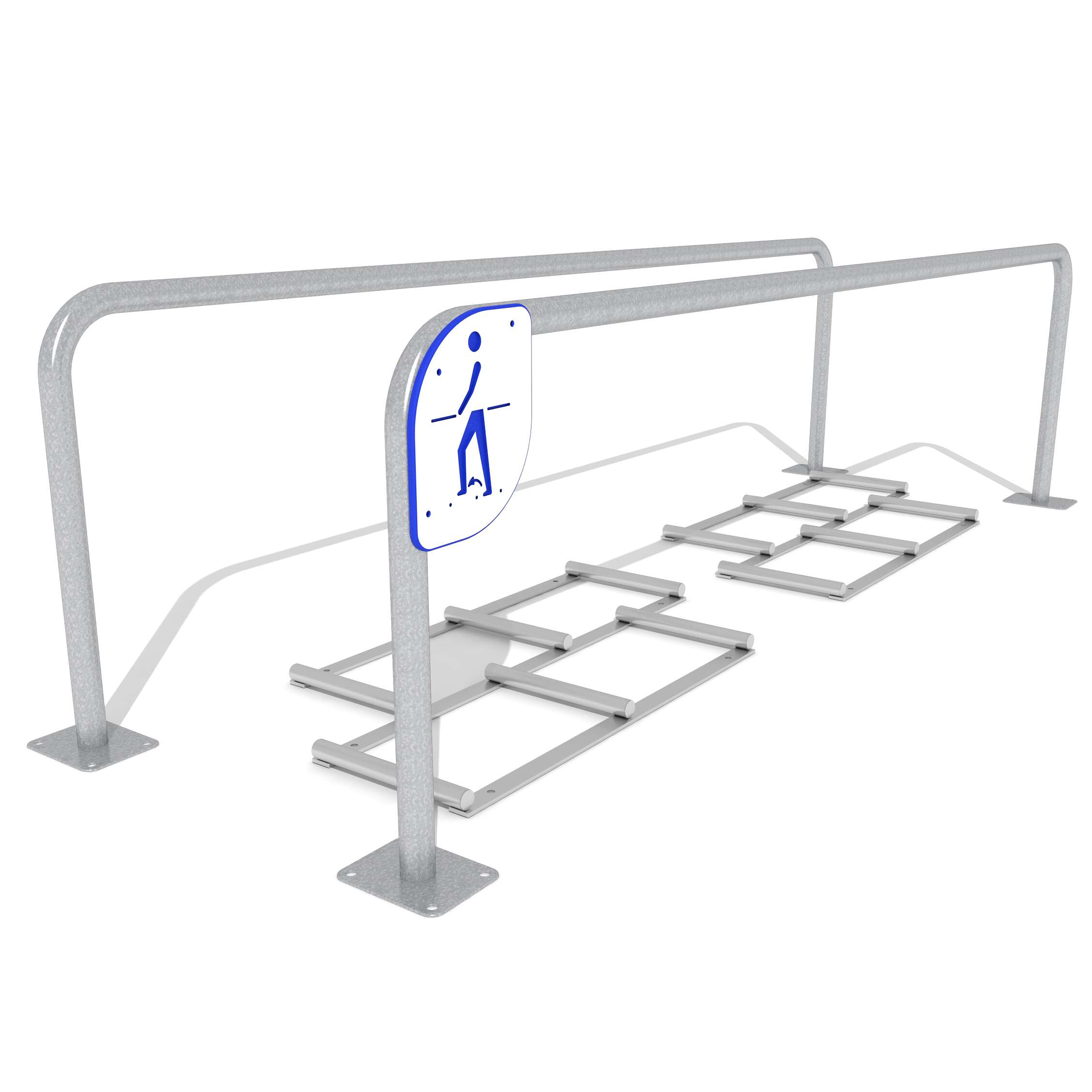 Die Hauptstruktur des Hindernisparcours besteht aus hochwertigem, pulverbeschichtetem Stahl, der für seine extreme Widerstandsfähigkeit gegen Korrosion und Verwitterung bekannt ist. Die Oberflächen sind mit einer UV-beständigen Pulverbeschichtung versehen, die Ausbleichen verhindert und das Metall effektiv schützt.