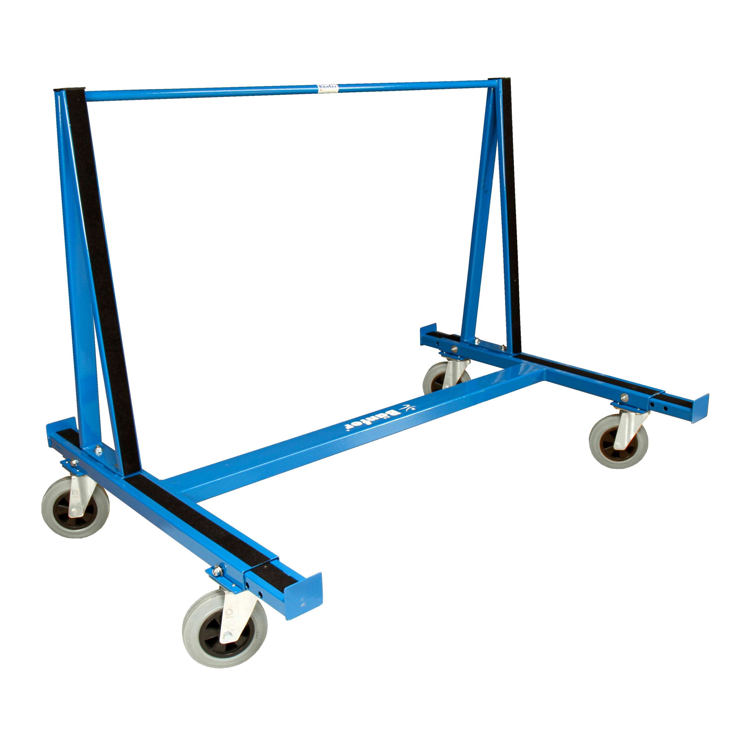Der Wagen verfügt über eine stabile Konstruktion, stoßabsorbierende Elemente zum Schutz der Bahn und oft auch über Fixierungspunkte, um die zusammengerollte Bahn während des Transports zu sichern. Feststellbare Rollen erhöhen die Standsicherheit.