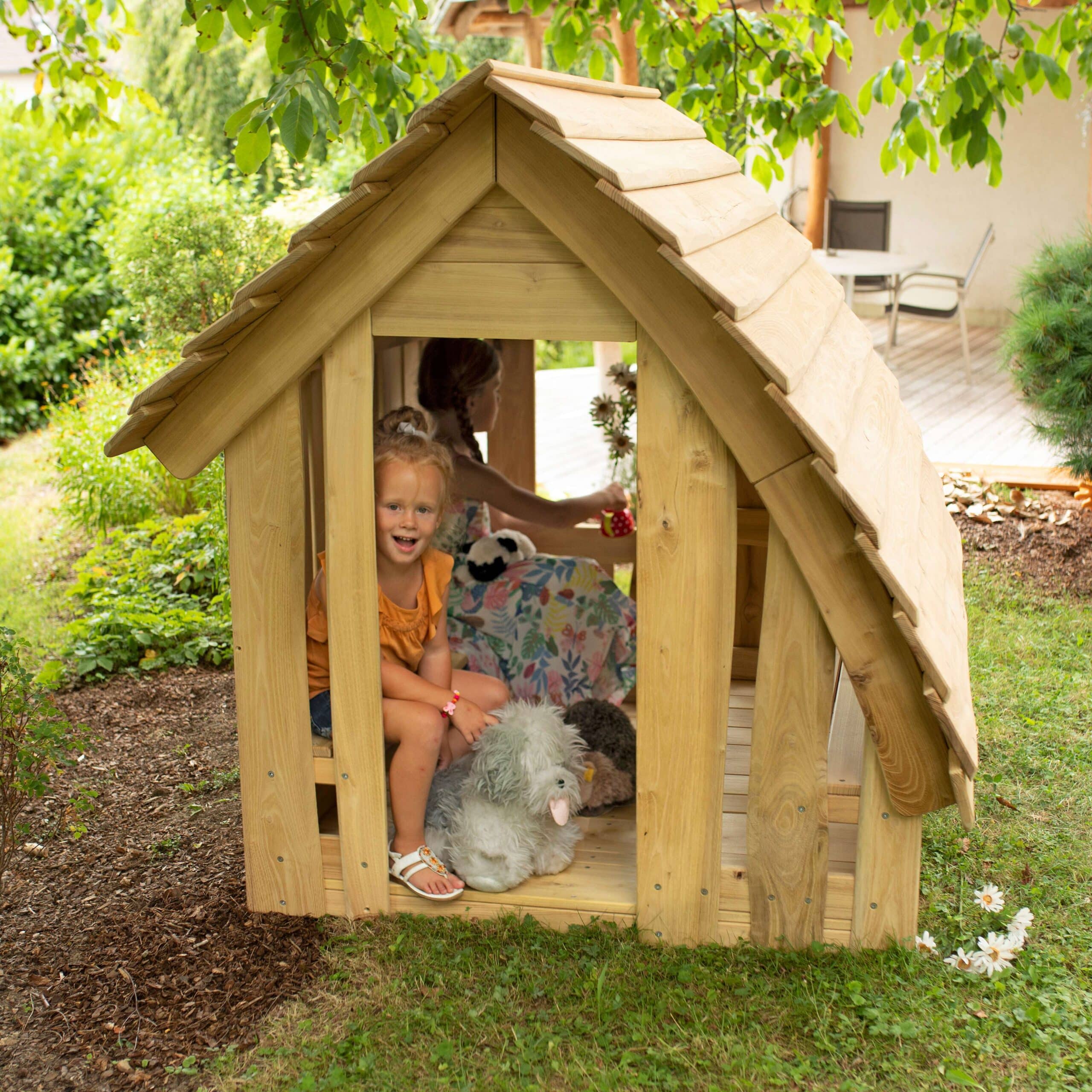 | Design-Merkmale | Natürliche Optik, inspiriert von einer Waldhütte, integrierter Spielwert durch erhöhte Positionen oder Veranda möglich |