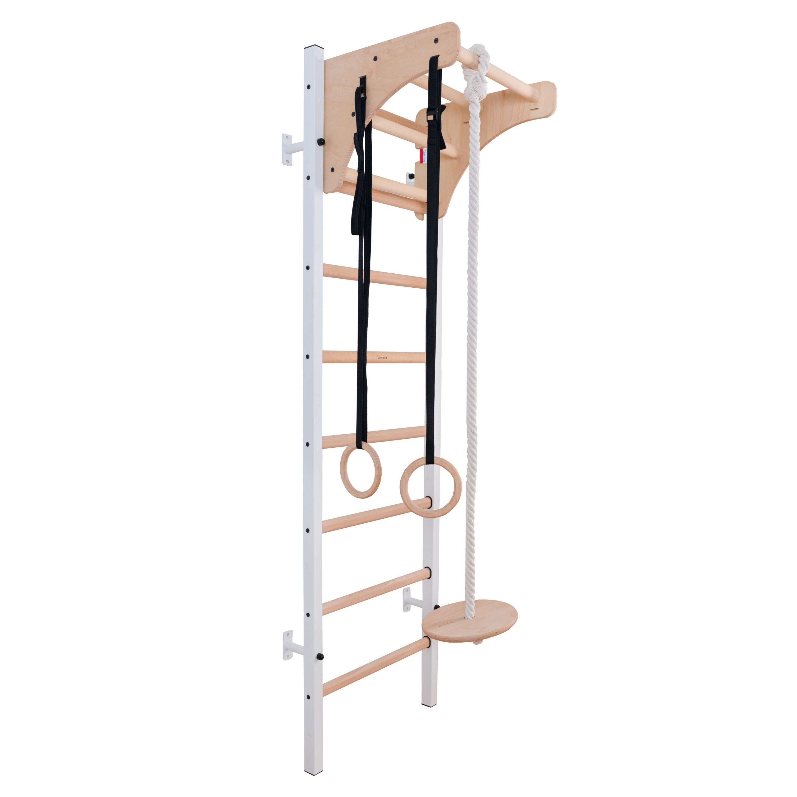 Die Sprossenwand besteht aus massivem, langlebigem Buchenholz, das umweltfreundlich lackiert ist. Das Zubehör wird aus robustem Stahl, Holz und strapazierfähigen Seilen gefertigt. BenchK legt großen Wert auf hochwertige Materialien und Verarbeitung für Sicherheit und Langlebigkeit.