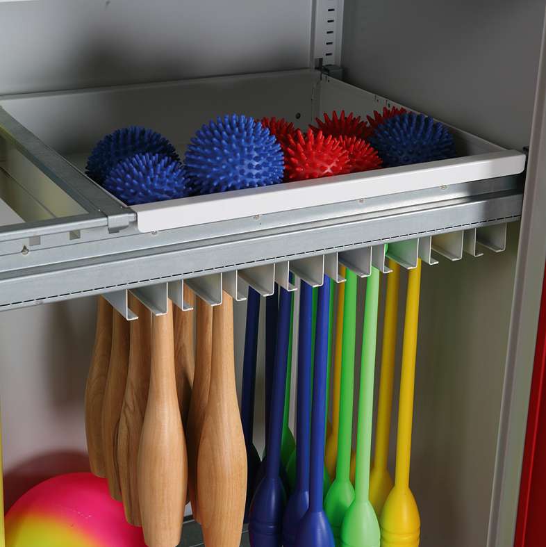 Optimale Organisation für Ihren Sportgeräteschrank: Die C+P Ablageschale mit Keulenhalterung
