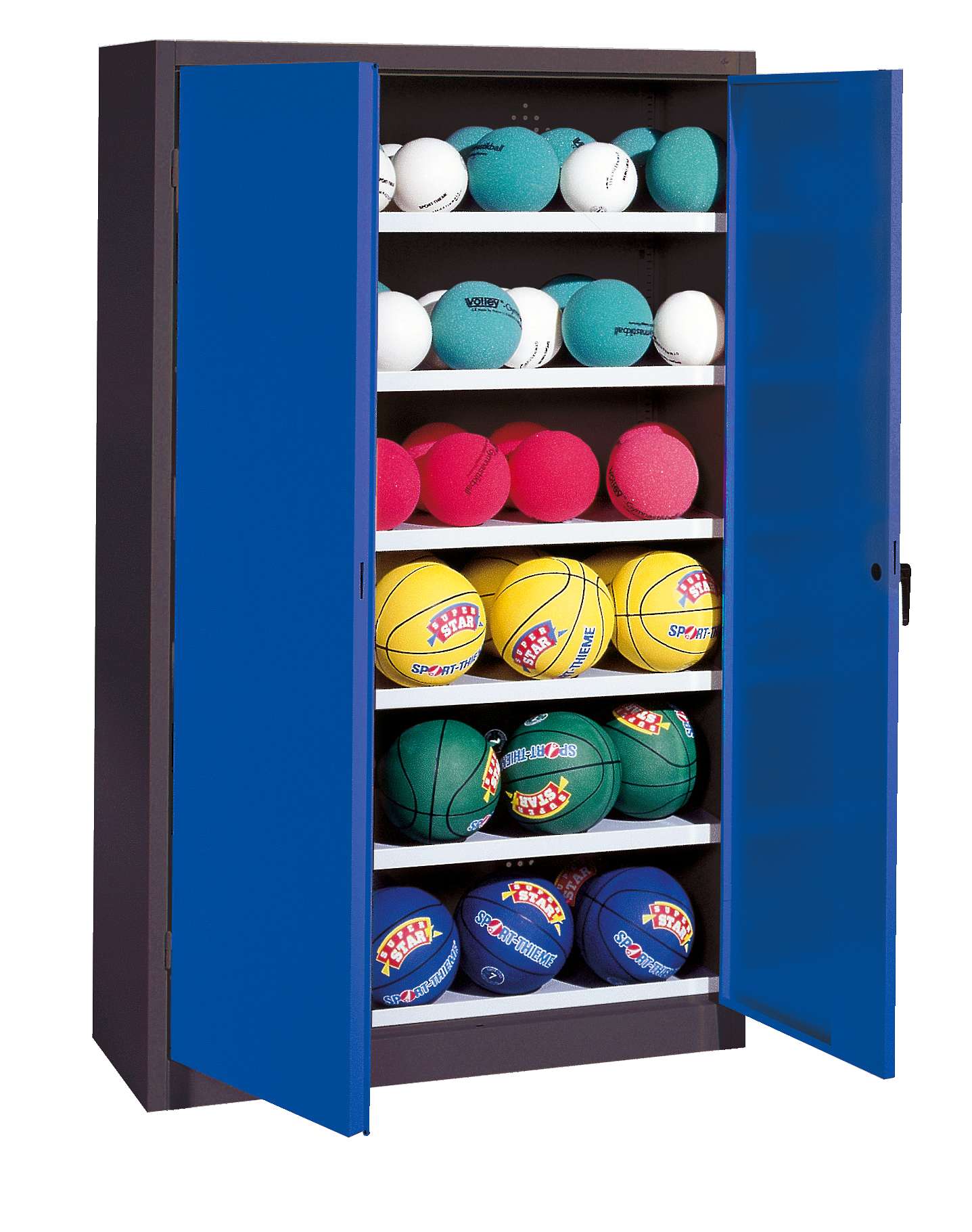 Der C+P Ballschrank mit Vollblech-Flügeltüren (Typ 3) in den eleganten Farben Enzianblau (RAL 5010) und Anthrazit (RAL 7021) ist die ideale Aufbewahrungslösung für Vereine, Sportzentren und Bildungseinrichtungen. Mit seinen großzügigen Abmessungen von 195x120x40 cm (HxBxT) bietet dieser robuste Schrank ausreichend Platz für die sichere und geordnete Lagerung von Bällen und anderer Sportausrüstung. Dank der Einzelschließung pro Fach profitieren Sie von maximaler Sicherheit und Zugriffskontrolle.