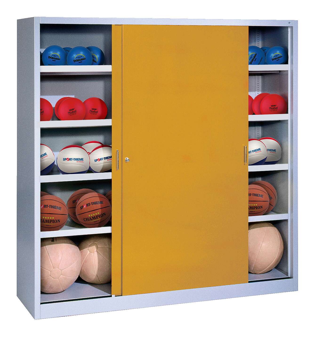 Neben der reinen Funktionalität spielt auch das Design eine wichtige Rolle für die Atmosphäre in einer Sportstätte. Der C+P Ballschrank ist in den Farben Goldgelb (RAL 1004) und Lichtgrau (RAL 7035) erhältlich, was Ihnen die Möglichkeit gibt, den Schrank optisch an Ihre bestehende Einrichtung anzupassen. Diese Farbgebung ist nicht nur modern, sondern auch praxisorientiert, da sie Verschmutzungen weniger sichtbar macht. Die klaren Linien und die hochwertige Pulverbeschichtung verleihen dem Schrank ein professionelles und ansprechendes Erscheinungsbild, das die Wertigkeit Ihrer Sportanlage unterstreicht.