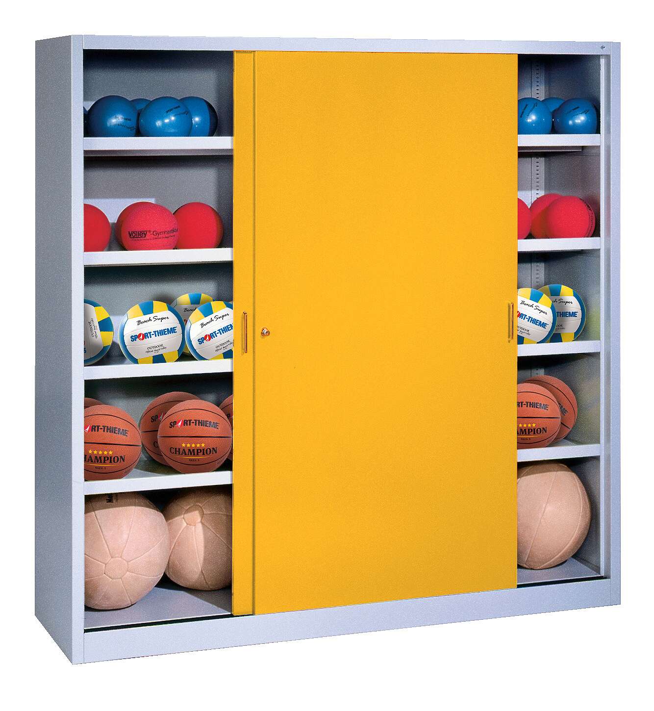 FAQ – Häufig gestellte Fragen zu C+P Ballschrank mit Vollblech-Schiebetüren (Typ 4), HxBxT 195x160x50 cm, Verkehrsgelb (RAL 1023), Lichtgrau (RAL 7035), Gleichschließung