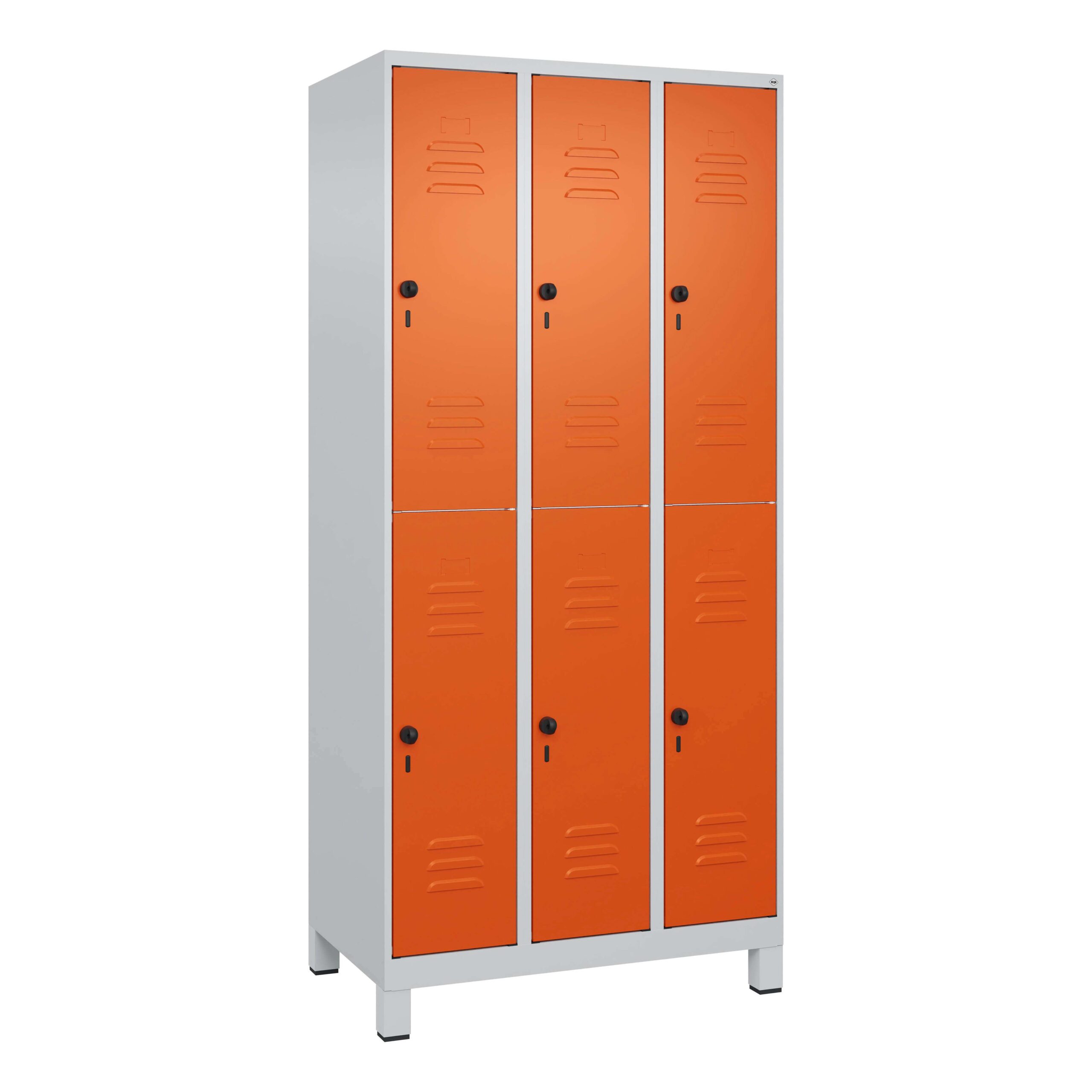 Der C+P Doppel-Garderobenschrank „Classic Plus“ ist darauf ausgelegt, den vorhandenen Platz maximal auszunutzen. Die Aufteilung in zwei vertikal übereinanderliegende Reihen mit jeweils drei Fächern ermöglicht eine effiziente Nutzung der Höhe. Jedes Fach bietet mit seiner Breite von 30 cm ausreichend Raum für die Aufbewahrung von Arbeitskleidung, Sportutensilien oder persönlichen Gegenständen. Die stabile Konstruktion aus hochwertigem Stahlblech garantiert eine hohe Belastbarkeit und Langlebigkeit, selbst bei intensiver Nutzung im gewerblichen oder öffentlichen Bereich. Die integrierten Füße erhöhen die Bodenfreiheit, was die Reinigung erleichtert und vor Feuchtigkeit schützt.