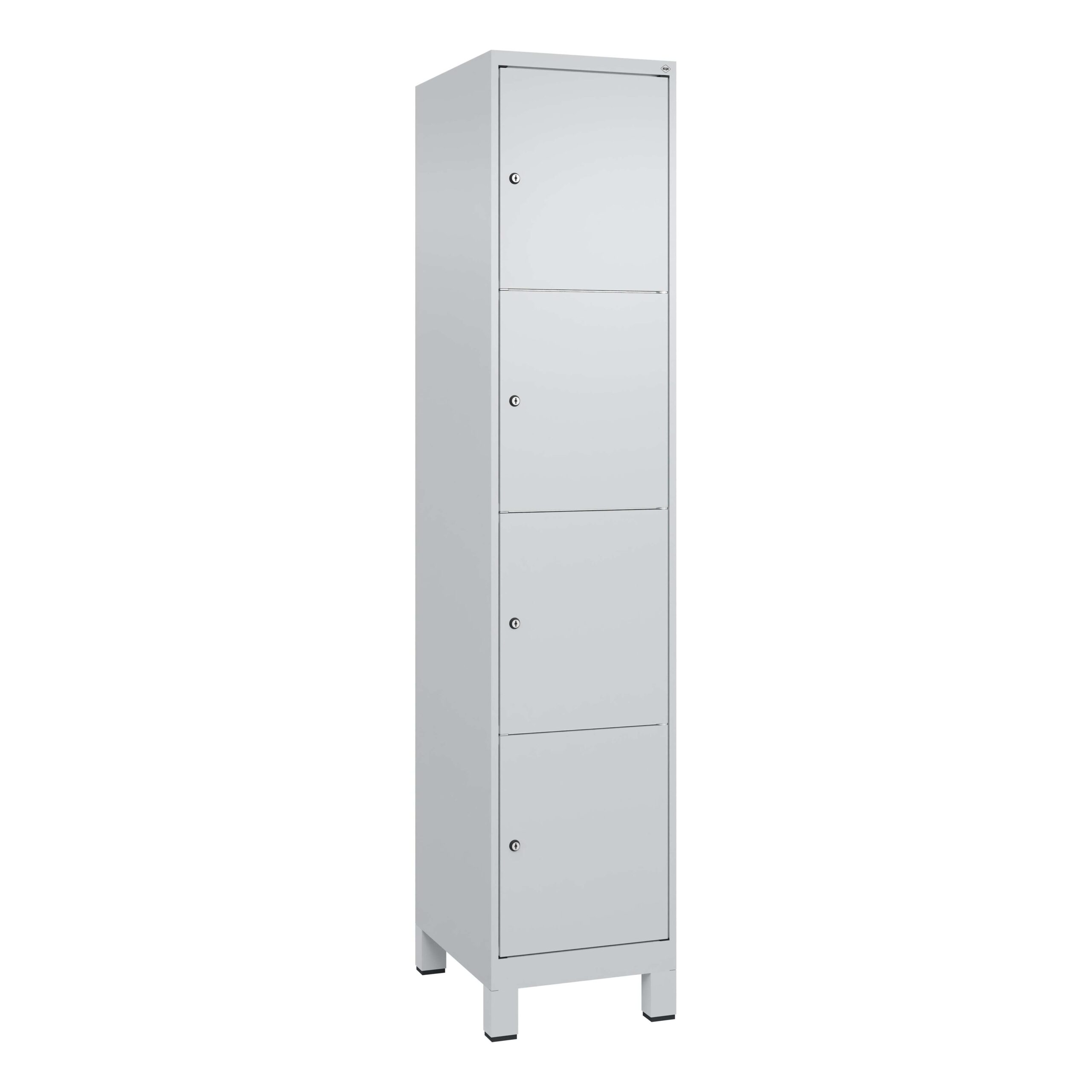 Die Abteilbreite von 40 cm pro Fach ermöglicht die bequeme Unterbringung von unterschiedlichsten Gegenständen, von größeren Taschen bis hin zu Ordnern. Die vier Fächer sind übereinander angeordnet, was eine optimale Raumnutzung auf einer geringen Stellfläche ermöglicht. Die integrierten Füße sorgen für eine leichte Anhebung des Schranks vom Boden, was die Reinigung erleichtert und vor Feuchtigkeit schützt. Die ansprechende lichtgraue Farbgebung (RAL 7035) fügt sich harmonisch in nahezu jede Umgebung ein und verleiht dem Raum ein professionelles Erscheinungsbild.