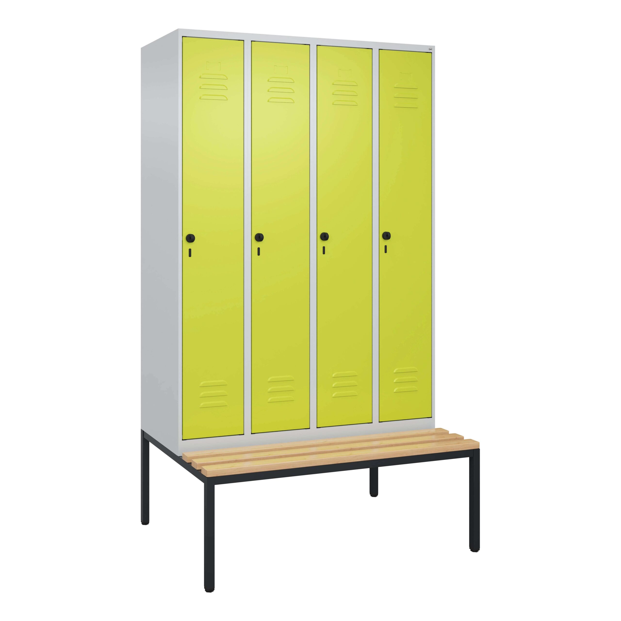 Der C+P Garderobenschrank „Classic Plus“ in Clowngrün (RAL 110 80 60) bietet mit seiner Abteilbreite von 30 cm, einer Gesamtbreite von 120 cm und einer Tiefe von 50 cm eine optimale Lösung zur geordneten Aufbewahrung in Umkleidebereichen. Mit seinen 4 Fächern und der integrierten Sitzbank ist er ideal für Sportstätten, Schwimmbäder, industrielle Umgebungen oder öffentliche Einrichtungen, wo Langlebigkeit und Funktionalität im Vordergrund stehen.