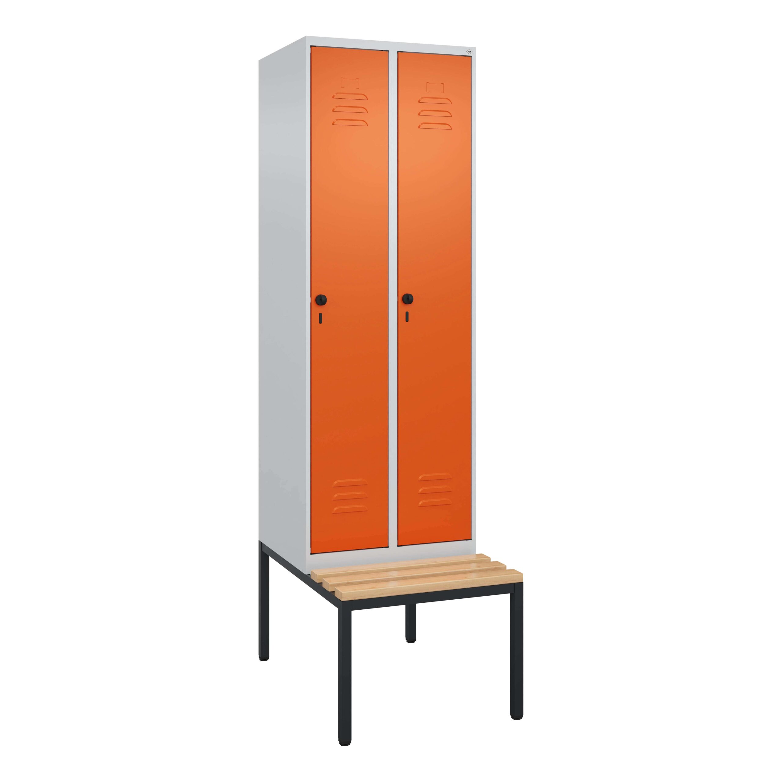 Die Farbe Reinorange (RAL 2004) verleiht dem Garderobenschrank „Classic Plus“ eine moderne und dynamische Ausstrahlung. Diese lebendige Farbgebung kann zur positiven Gestaltung von Arbeits- und Umkleidebereichen beitragen, indem sie für Helligkeit und Energie sorgt. Abseits der rein funktionalen Aspekte ist der Schrank auch optisch ansprechend gestaltet. Klare Linien und eine aufgeräumte Formgebung integrieren sich harmonisch in verschiedene Einrichtungsstile. Die integrierte Sitzbank ist funktional und fügt sich nahtlos in das Gesamtbild ein, ohne den Schrank überladen wirken zu lassen. Diese Symbiose aus Funktionalität und ansprechender Ästhetik macht den C+P Garderobenschrank „Classic Plus“ zu einer Bereicherung für jeden Raum.