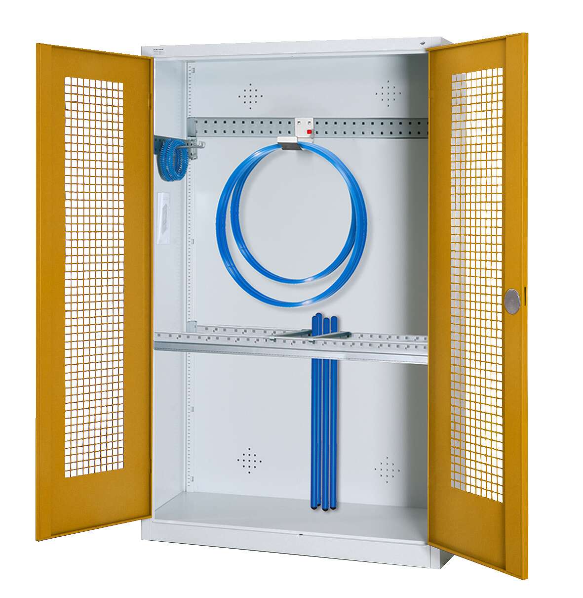FAQ – Häufig gestellte Fragen zu C+P Modul-Sportgeräteschrank „Grundausstattung“ mit Lochblech-Flügeltüren, HxBxT 195x120x50 cm, Ergo-Lock Muldengriff, Goldgelb (RAL 1004), Lichtgrau (RAL 7035), Gleichschließung