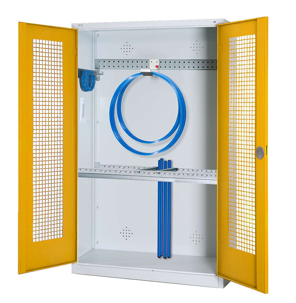 Die Türen des C+P Modul-Sportgeräteschranks „Grundausstattung“ sind als Lochblech-Flügeltüren ausgeführt. Dies ermöglicht eine kontinuierliche Luftzirkulation im Inneren des Schranks, was besonders vorteilhaft ist, um die Aufbewahrung von Sporttextilien oder -geräten zu belüften und Geruchsbildung zu vermeiden.