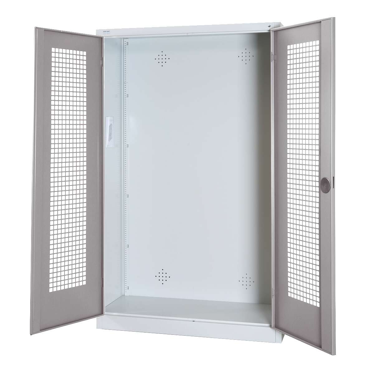 Die Lochblechstruktur der Flügeltüren ist sorgfältig gearbeitet und ermöglicht eine effektive Belüftung der Schrankinnenräume. Dies ist besonders wichtig in Umgebungen, in denen Sportkleidung oder feuchte Textilien aufbewahrt werden, da es die Bildung von unangenehmen Gerüchen minimiert und die Hygiene fördert. Die Türen sind mit stabilen Scharnieren versehen, die ein reibungsloses Öffnen und Schließen über viele Jahre hinweg gewährleisten.