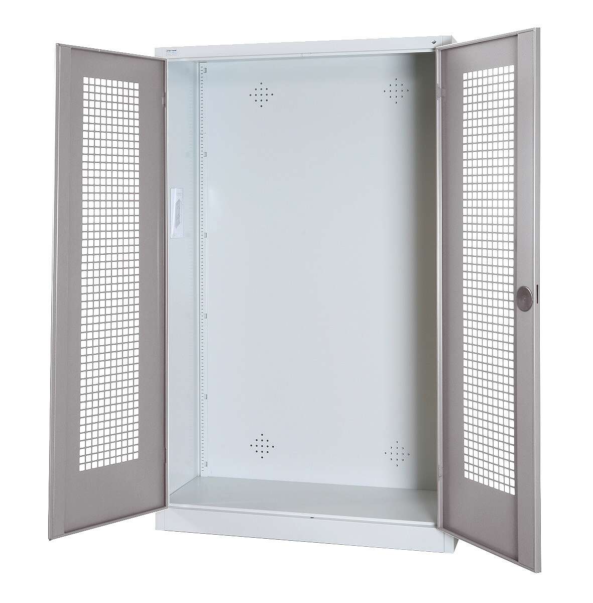 Dank der robusten Stahlkonstruktion und der pulverbeschichteten Oberfläche ist der Schrank gut gegen Korrosion geschützt. Die Lochblech-Flügeltüren fördern zudem die Belüftung und minimieren das Risiko von Feuchtigkeitsansammlungen.
