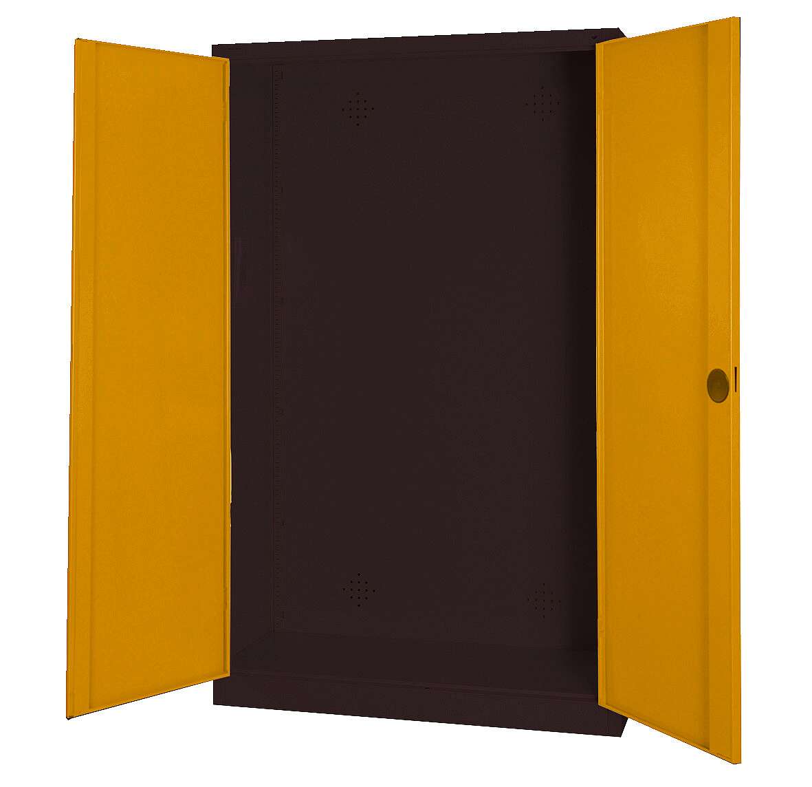 Die Farbkombination aus Goldgelb (RAL 1004) und Anthrazit (RAL 7021) verleiht dem Schrank eine moderne und professionelle Optik. Goldgelb steht für Energie und Dynamik, während Anthrazit eine elegante und unaufdringliche Basis bildet. Diese Farbwahl fügt sich nahtlos in das Design vieler Sport- und Fitnessanlagen ein und trägt zu einer ansprechenden Atmosphäre bei. Die pulverbeschichtete Oberfläche sorgt für eine gleichmäßige und strapazierfähige Farbgebung, die auch nach Jahren der Nutzung ihre Brillanz behält.