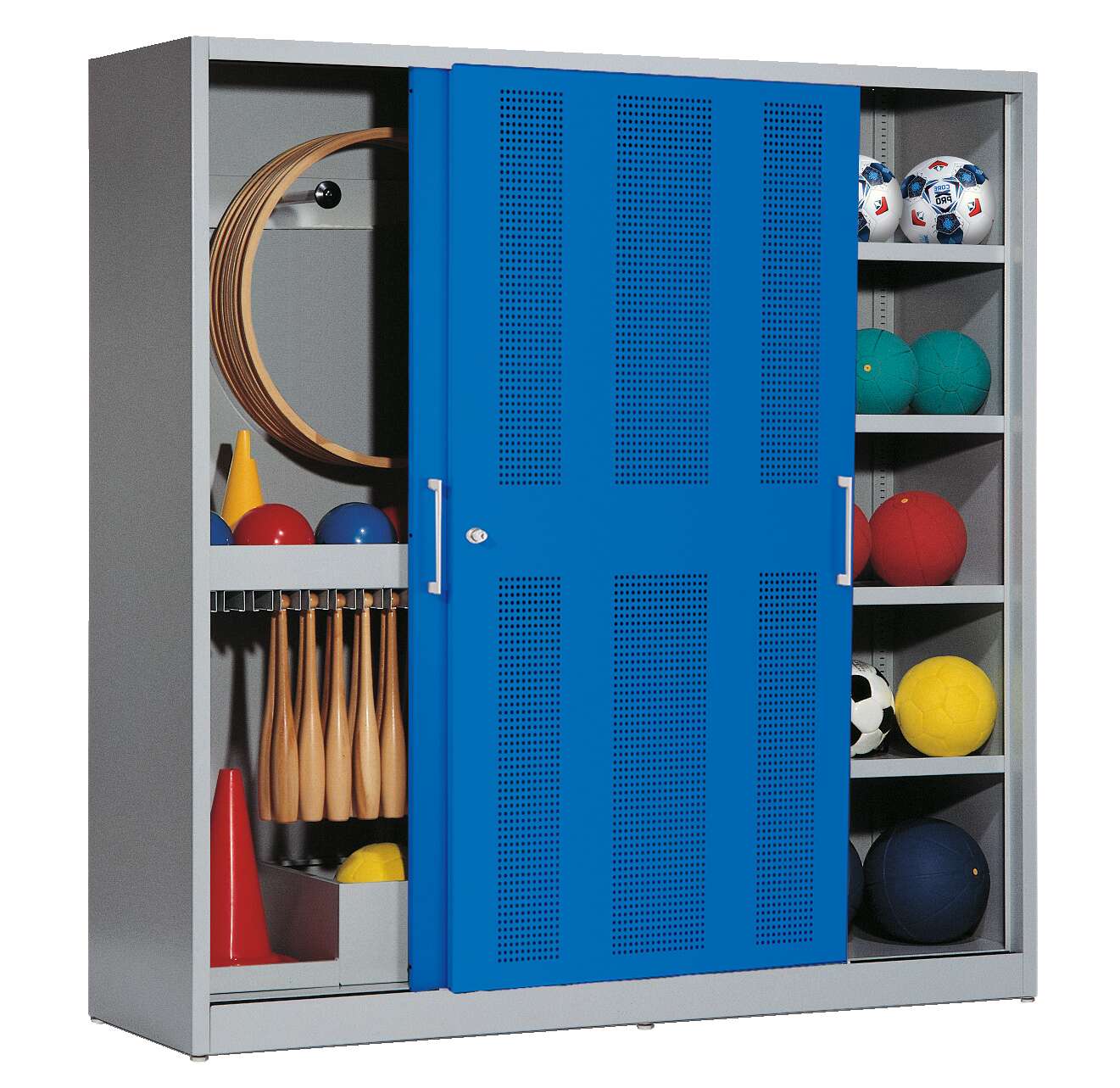 C+P Sportgeräteschrank mit Lochblech-Schiebetüren (Typ 5), HxBxT 195x190x60 cm, Enzianblau (RAL 5010), Lichtgrau (RAL 7035), Gleichschließung