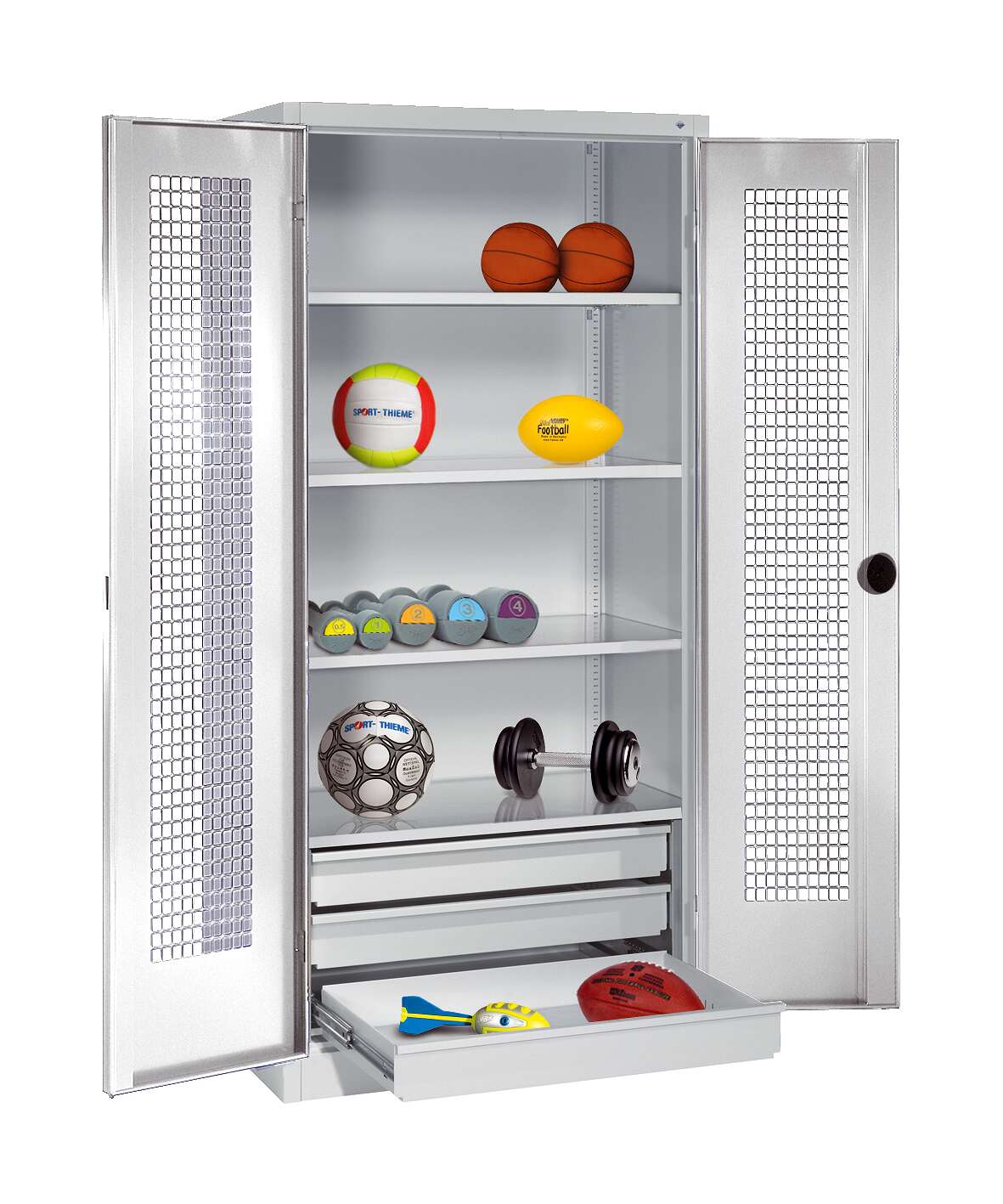 Optimale Organisation und Sicherheit für Sportvereine und Fitnessstudios: C+P Sportgeräteschrank mit Schubladen und Lochblech-Flügeltüren