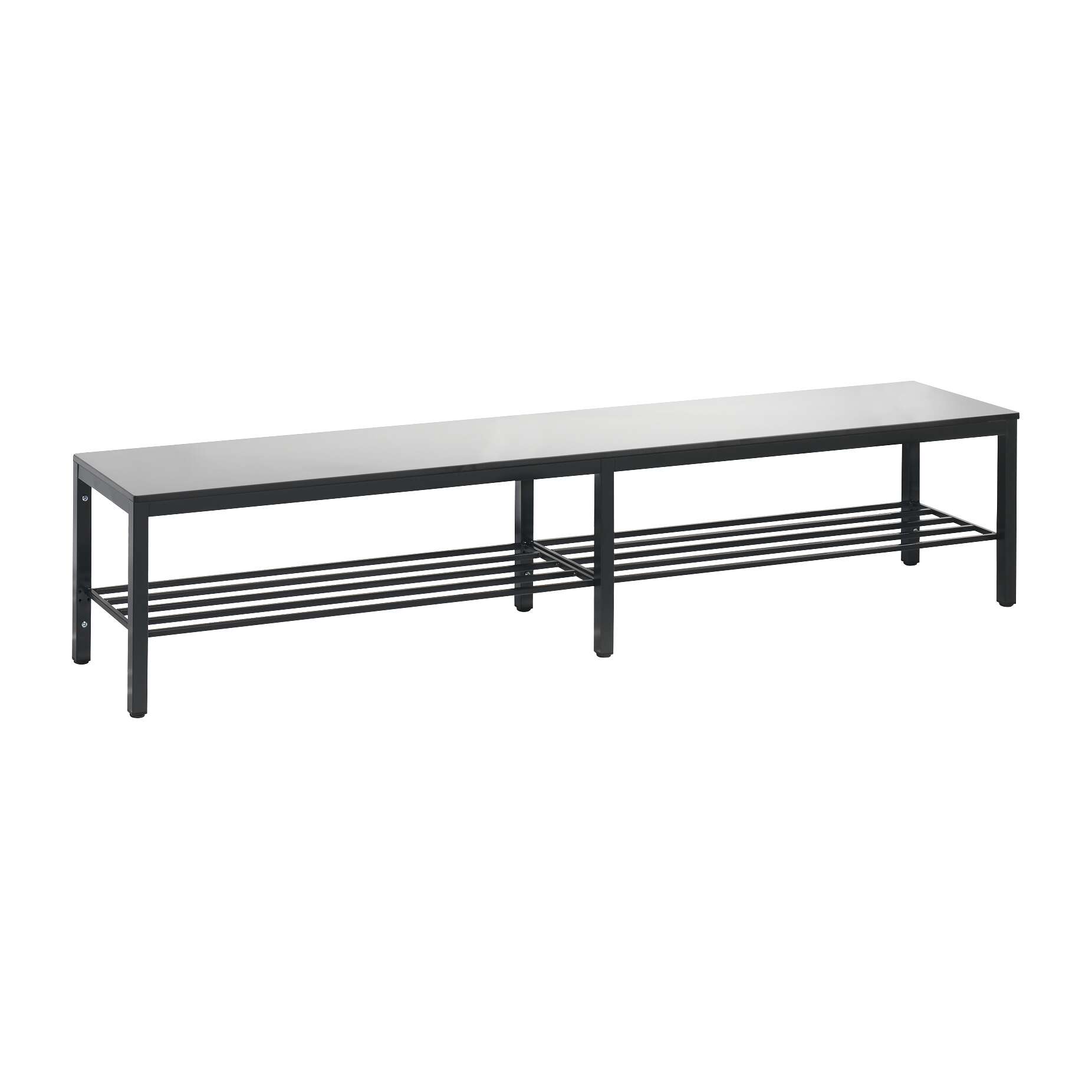 Der integrierte Schuhrost ist ein wesentlicher Bestandteil dieser Umkleidebank. Er ermöglicht die geordnete Aufbewahrung von Schuhen, trennt diese vom Sitzbereich und verhindert, dass Schmutz und Nässe unnötig verbreitet werden. Dies trägt maßgeblich zur Sauberkeit und Organisation der Umkleide bei und erhöht den Komfort für die Nutzer.