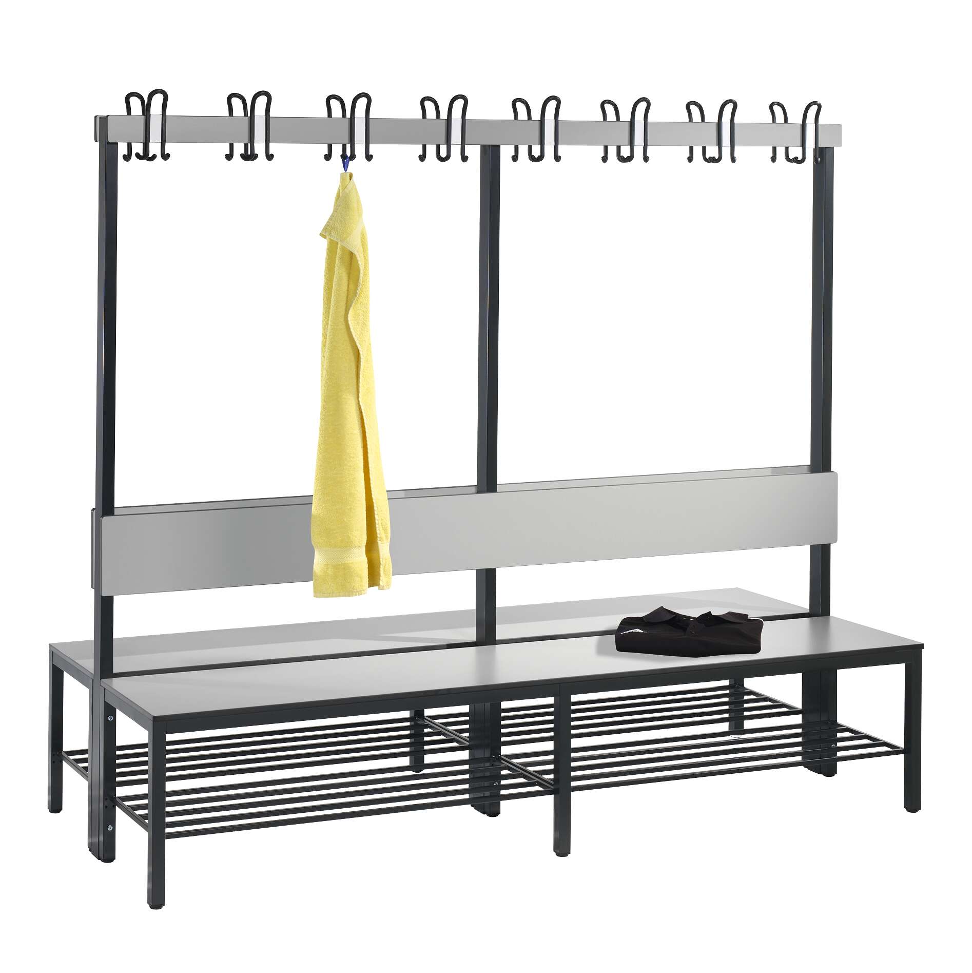 Die doppelseitige Ausführung ist ein Paradebeispiel für intelligente Raumnutzung. Sie ermöglicht es, dass Nutzer von beiden Seiten der Bank Platz nehmen können, was den Durchfluss in Umkleideräumen optimiert und Wartezeiten reduziert. Dies ist besonders in Stoßzeiten von Sportanlagen oder Fitnessstudios von großem Vorteil. Die integrierte Rückenlehne bietet einen entscheidenden Mehrwert an Komfort. Sie erlaubt es den Nutzern, sich anzulehnen und die Schuhe in einer entspannteren Haltung anzuziehen oder auszuziehen. Dies ist ein Detail, das den Unterschied in der Benutzerzufriedenheit ausmacht und die Funktionalität des Umkleidebereichs deutlich verbessert.
