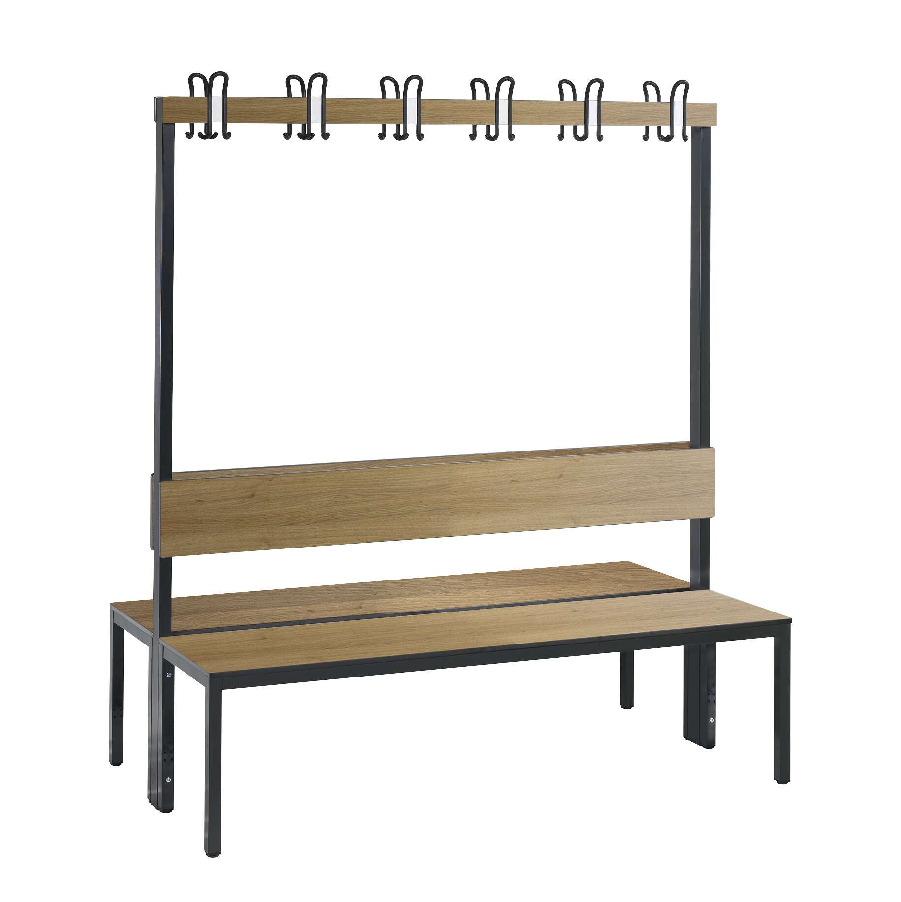 Die 1,5 Meter lange Umkleidebank bietet ausreichend Platz für mehrere Personen. Die integrierte Rückenlehne erhöht den Sitzkomfort erheblich und ermöglicht ein entspanntes An- und Ausziehen der Sport- oder Arbeitskleidung. Die Oberflächenveredelung in Eiche Sereno verleiht der Bank eine warme und natürliche Optik, die sich harmonisch in verschiedene Raumkonzepte einfügt. Das doppelseitige Design maximiert die Kapazität pro Fläche.