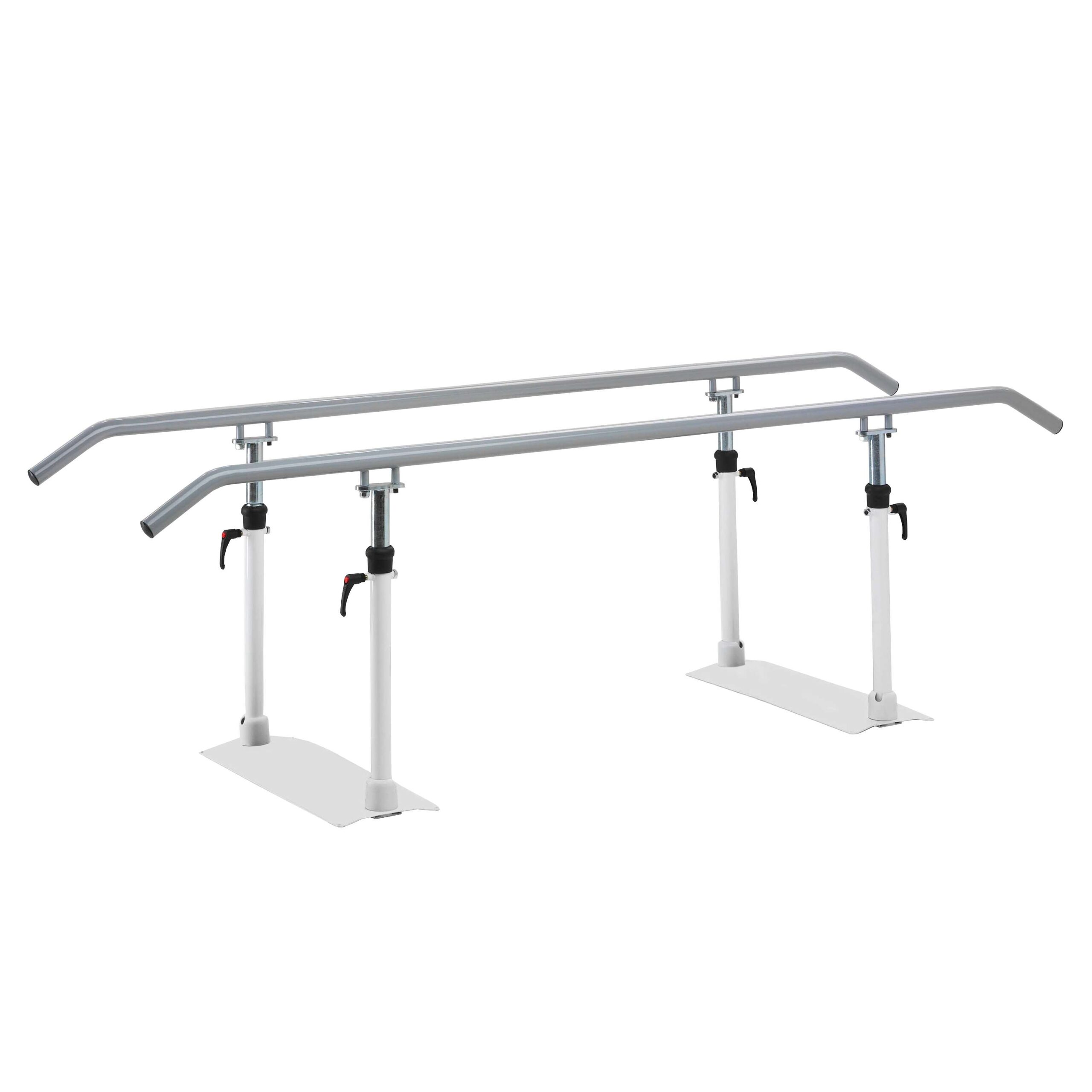 Die Gehbarren sollten auf einem ebenen und stabilen Untergrund aufgestellt werden. Für zusätzliche Sicherheit und zum Schutz des Bodens kann eine passende Gymnastikmatte oder Bodenschutzmatte untergelegt werden.