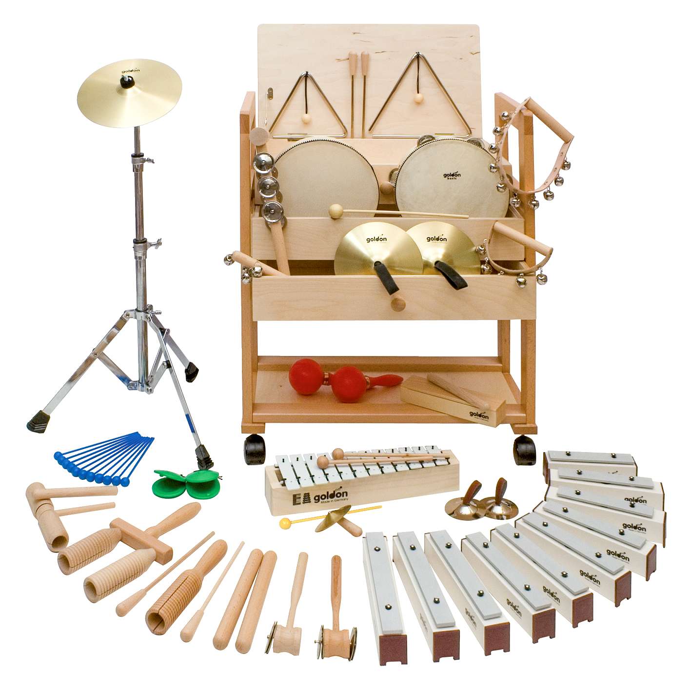 Typischerweise enthält ein solches Set eine Vielfalt an Perkussionsinstrumenten wie Klanghölzer, Rasseln, kleine Trommeln, Triangeln und oft auch einfache Klangstäbe, die jeweils unterschiedliche Klänge und Spielmöglichkeiten bieten.
