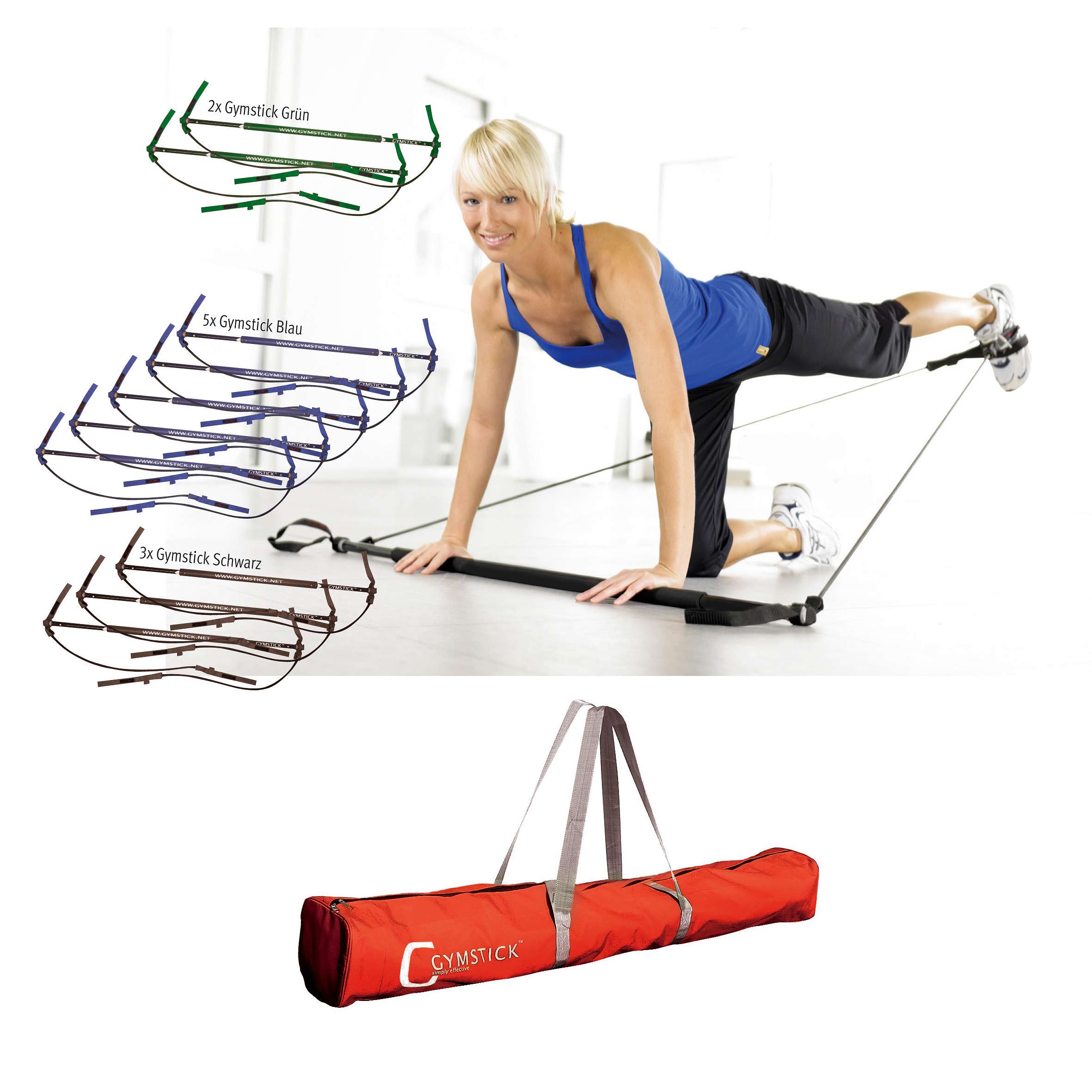 Mit dem Gymstick können Sie eine beeindruckende Vielfalt an Übungen für das gesamte Körpertraining durchführen. Dazu gehören Kraftübungen für Beine, Rumpf, Rücken, Brust, Schultern und Arme, aber auch Übungen zur Verbesserung der Flexibilität, des Gleichgewichts, der Koordination und der Schnellkraft. Das Set ermöglicht sowohl dynamische Bewegungen als auch isometrische Halteübungen.