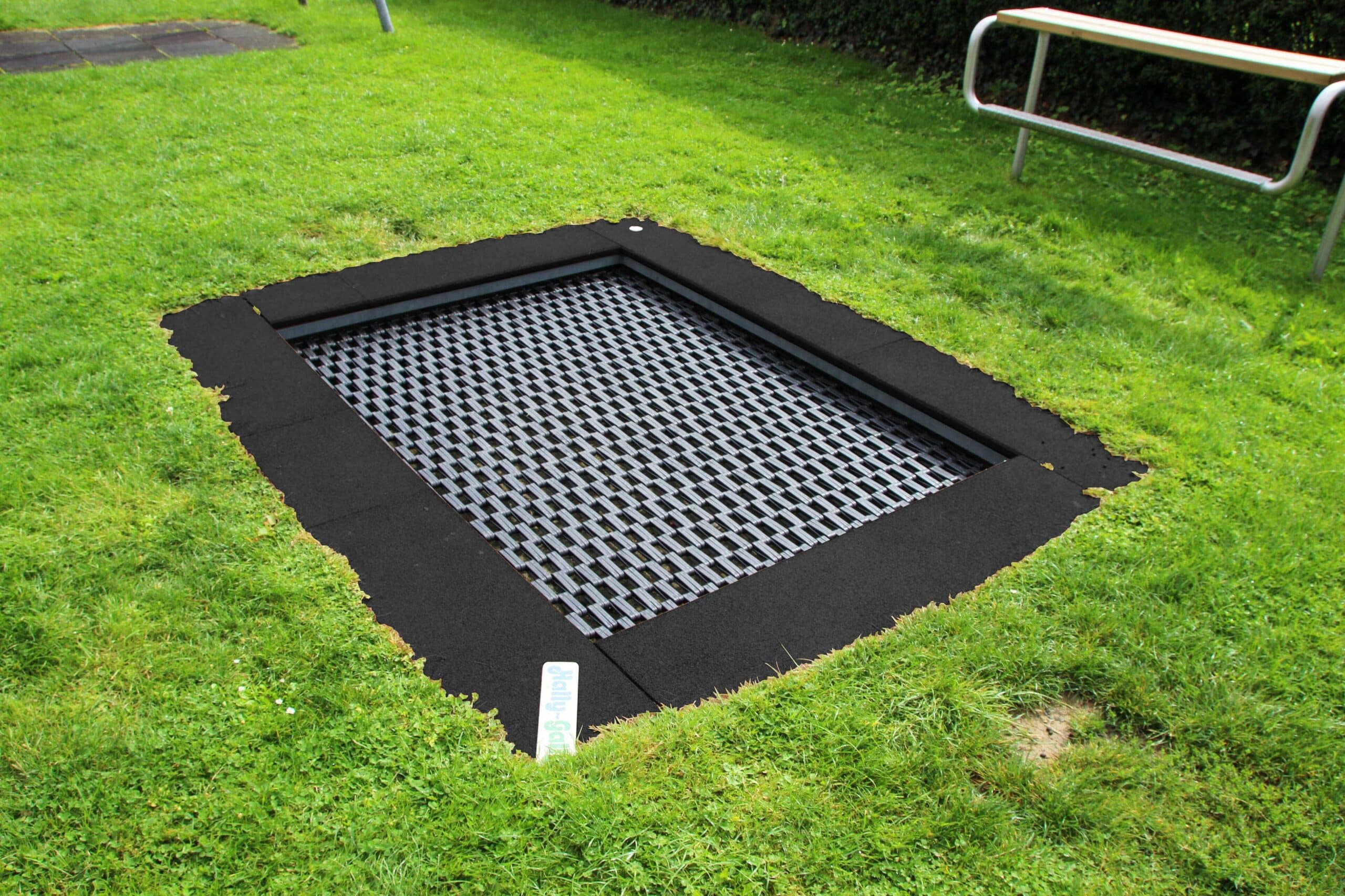 Das Hally-Gally Bodentrampolin „2012“ ist als Bodentrampolin konzipiert und wird direkt auf dem Erdboden platziert. Es ist kein aufwendiges Eingraben erforderlich. Die Stabilität wird durch das Eigengewicht und die solide Konstruktion gewährleistet. Für zusätzliche Sicherheit bei starken Windverhältnissen sind oft separate Bodensicherungssets als optionales Zubehör erhältlich, die eine feste Verankerung im Erdreich ermöglichen.