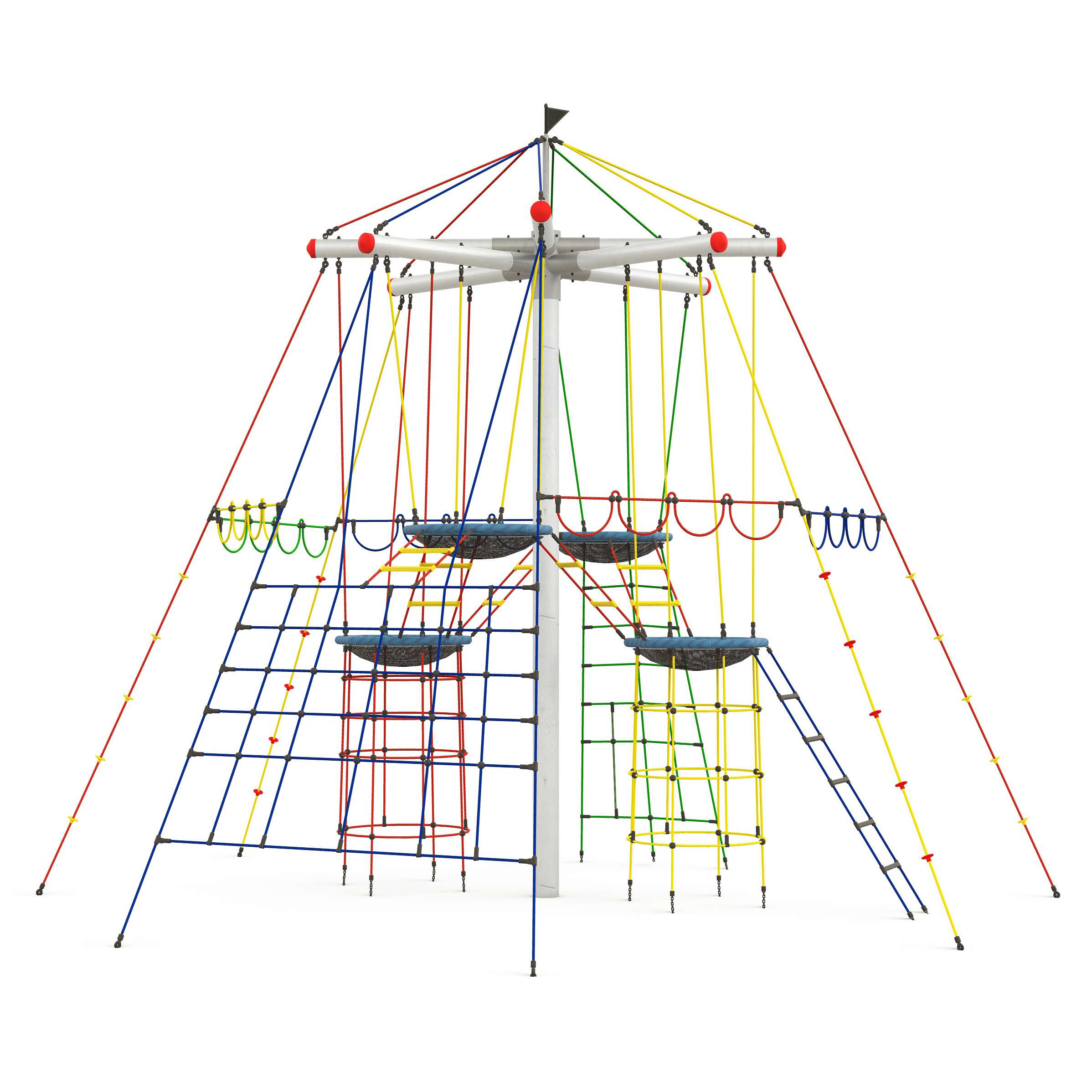 | Seilnetze | Die integrierten Seilnetze sind aus speziellen, hochfesten Seilen gefertigt, die für den Einsatz im Außenbereich konzipiert sind. Diese Seile sind UV-beständig, abriebfest und behalten auch bei starker Beanspruchung ihre Stabilität. Die Maschenweiten sind so gewählt, dass sie für verschiedene Altersgruppen von Kindern sicher zu greifen und zu überklettern sind, ohne dass Hängenbleiben von Kleidung oder Gliedmaßen zu befürchten ist. Die Seilnetze sind fest in die Stahlkonstruktion integriert und bieten verschiedene Kletter- und Liegeflächen. |