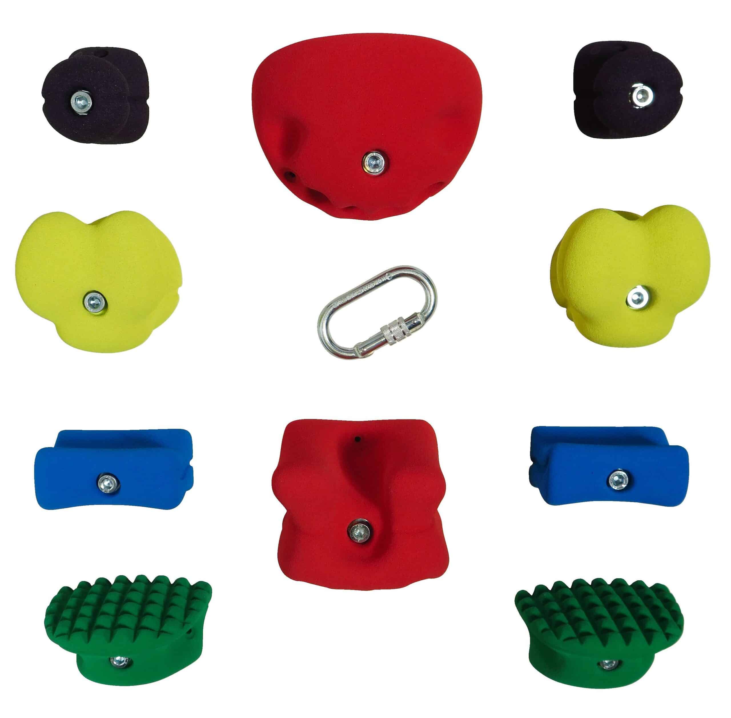 | Design-Merkmale | Das Set enthält eine ausgewogene Mischung aus verschiedenen Griffformen wie Leisten (unterschiedlicher Dicke), Zangen, Sloper und Jugs. Die anatomisch angepassten Formen fördern eine natürliche Handposition und reduzieren das Verletzungsrisiko. |