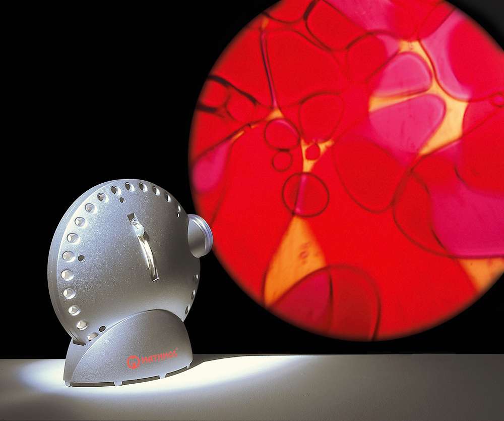 Der Mathmos Space-Projektor nutzt eine leistungsstarke LED-Lichtquelle, die durch eine speziell entwickelte Optik und ein internes Mechanismus gesteuert wird. Dieses System bricht und lenkt das Licht, um dynamische, fließende Muster auf Ihre Decke zu projizieren, die an kosmische Nebel und Sterne erinnern. Es handelt sich um eine Weiterentwicklung des klassischen Lava-Lampen-Prinzips, angewendet auf eine Projektion.