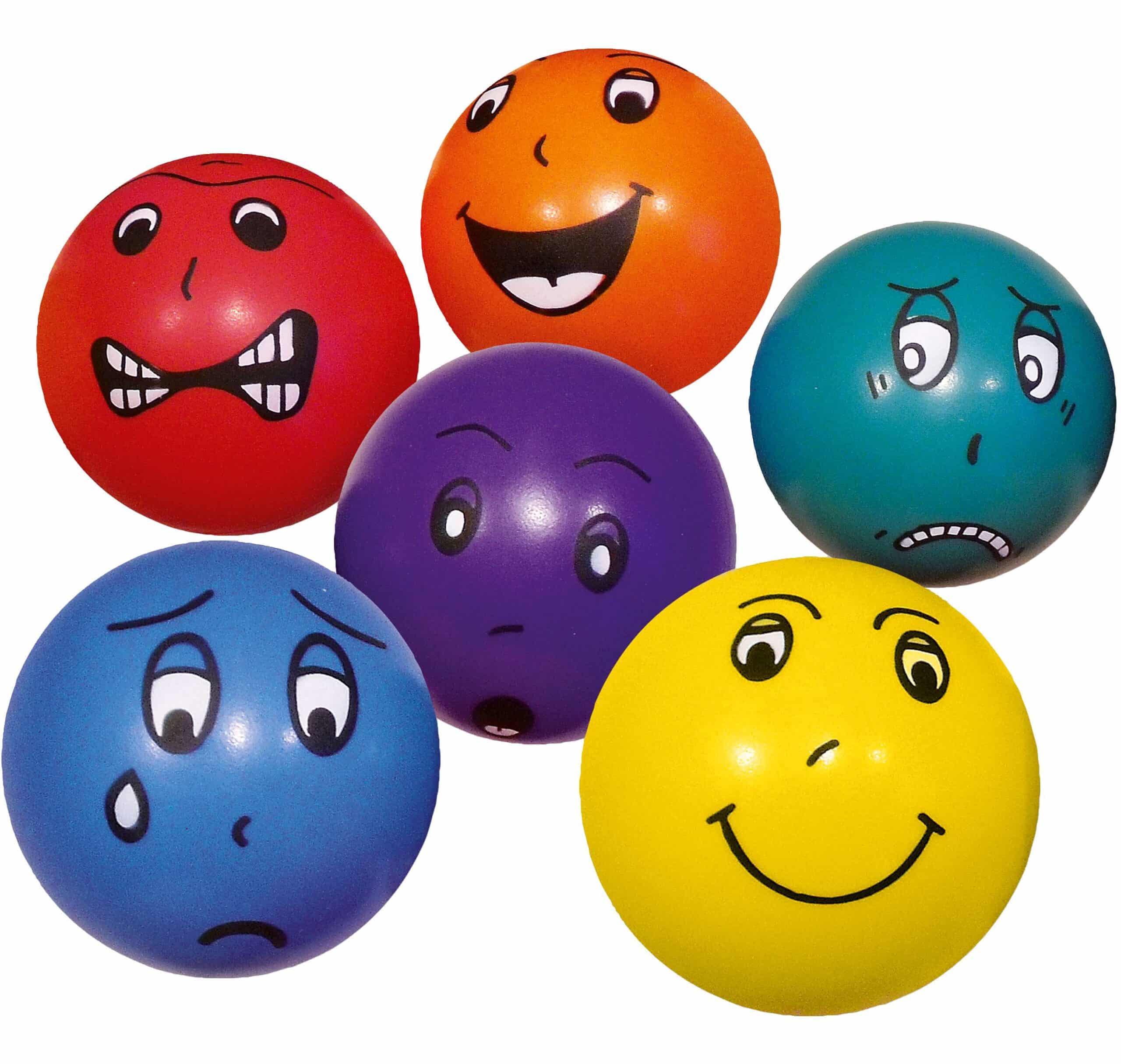 Das Set „Emotional Faces“ beinhaltet typischerweise Bälle mit grundlegenden, gut erkennbaren Emotionen wie Freude, Trauer, Überraschung, Wut und möglicherweise Angst oder Verwirrung. Die genaue Auswahl kann leicht variieren.