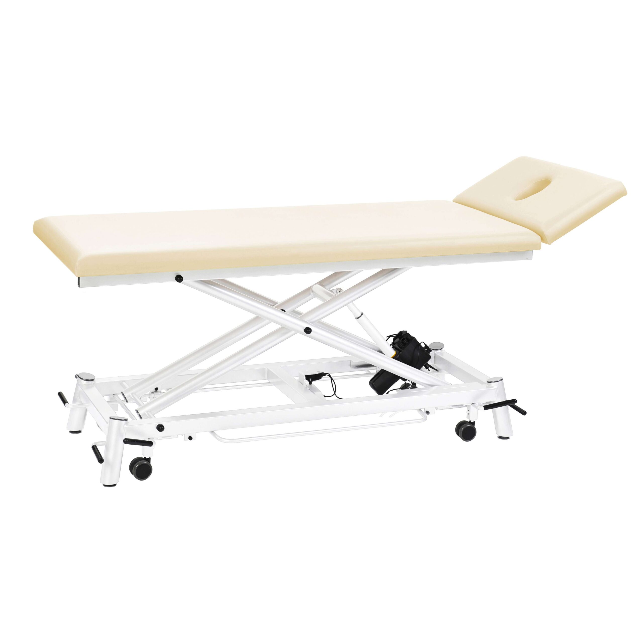 Die Höhenverstellung erfolgt elektrisch über ein intuitiv bedienbares Steuerungselement. Zwei Motoren ermöglichen eine stufenlose und präzise Anpassung der Liegenhöhe, um eine optimale Arbeitsposition für den Therapeuten und einen bequemen Zugang für den Patienten zu gewährleisten.