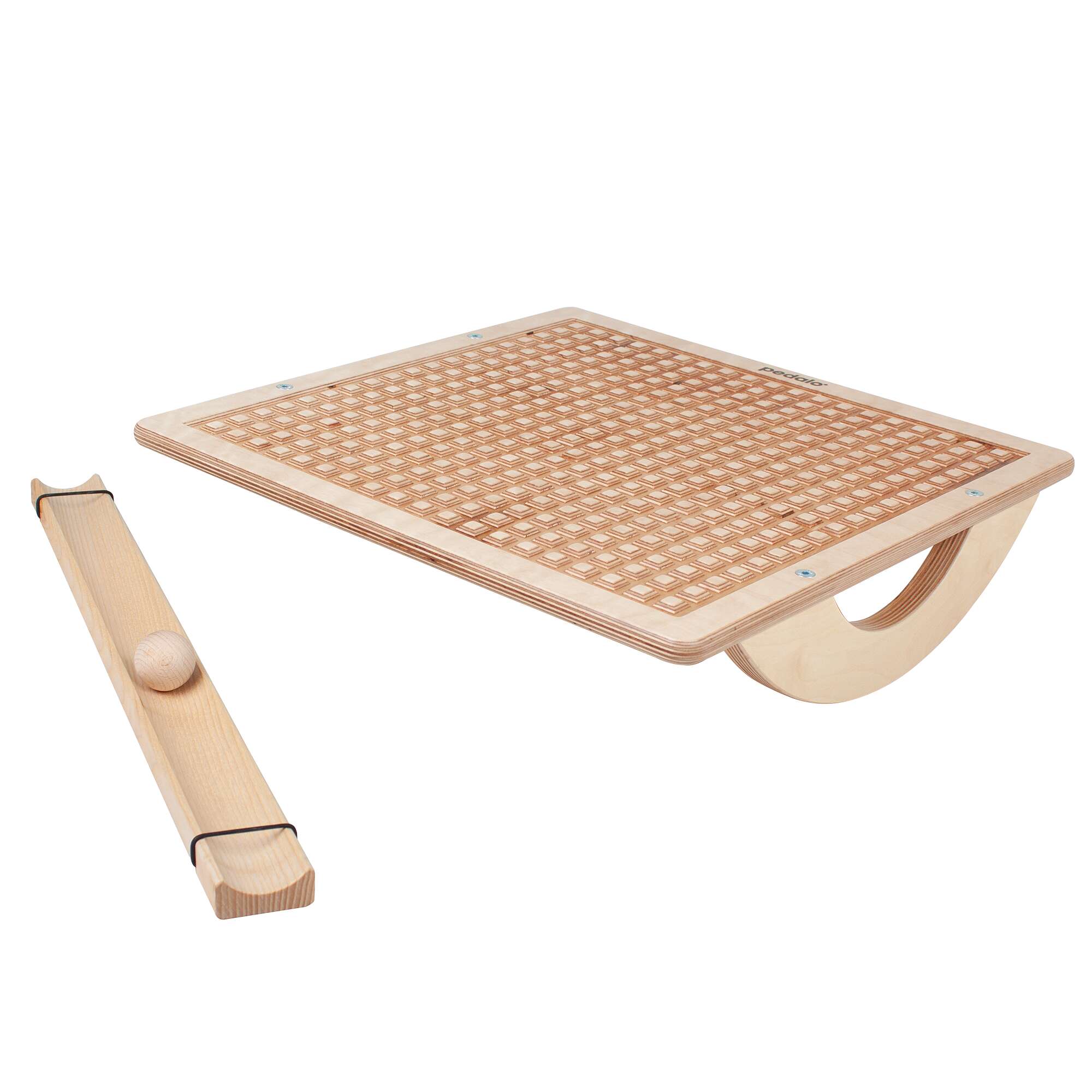 Die Unterseite des Wippbretts ist mit einer stabilen, aber dennoch flexiblen Plattform ausgestattet, die die charakteristische Wippbewegung ermöglicht. Die Konstruktion ist so ausgelegt, dass sie ein breites Bewegungsspektrum zulässt, ohne dabei die Stabilität des Geräts zu kompromittieren. Die Achse, um die sich das Brett neigt, ist robust und präzise gefertigt, um eine gleichmäßige und kontrollierbare Bewegung über die gesamte Lebensdauer des Produkts zu gewährleisten.