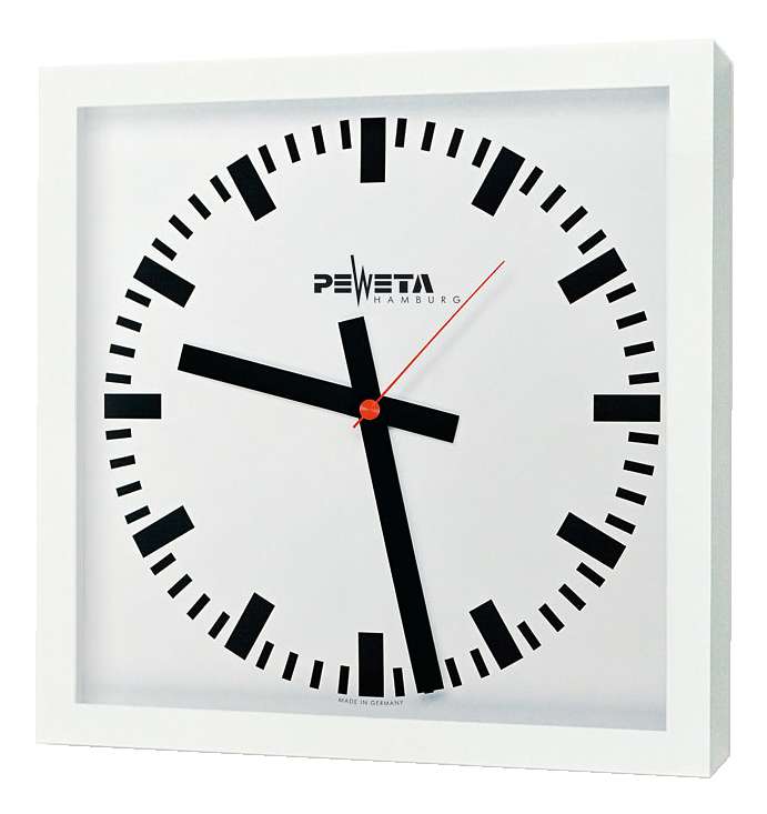 FAQ – Häufig gestellte Fragen zu Peweta Funk-Wanduhr „40×40“, Ballwurfsicher, Netzbetrieb, Zifferblatt DIN-Balken