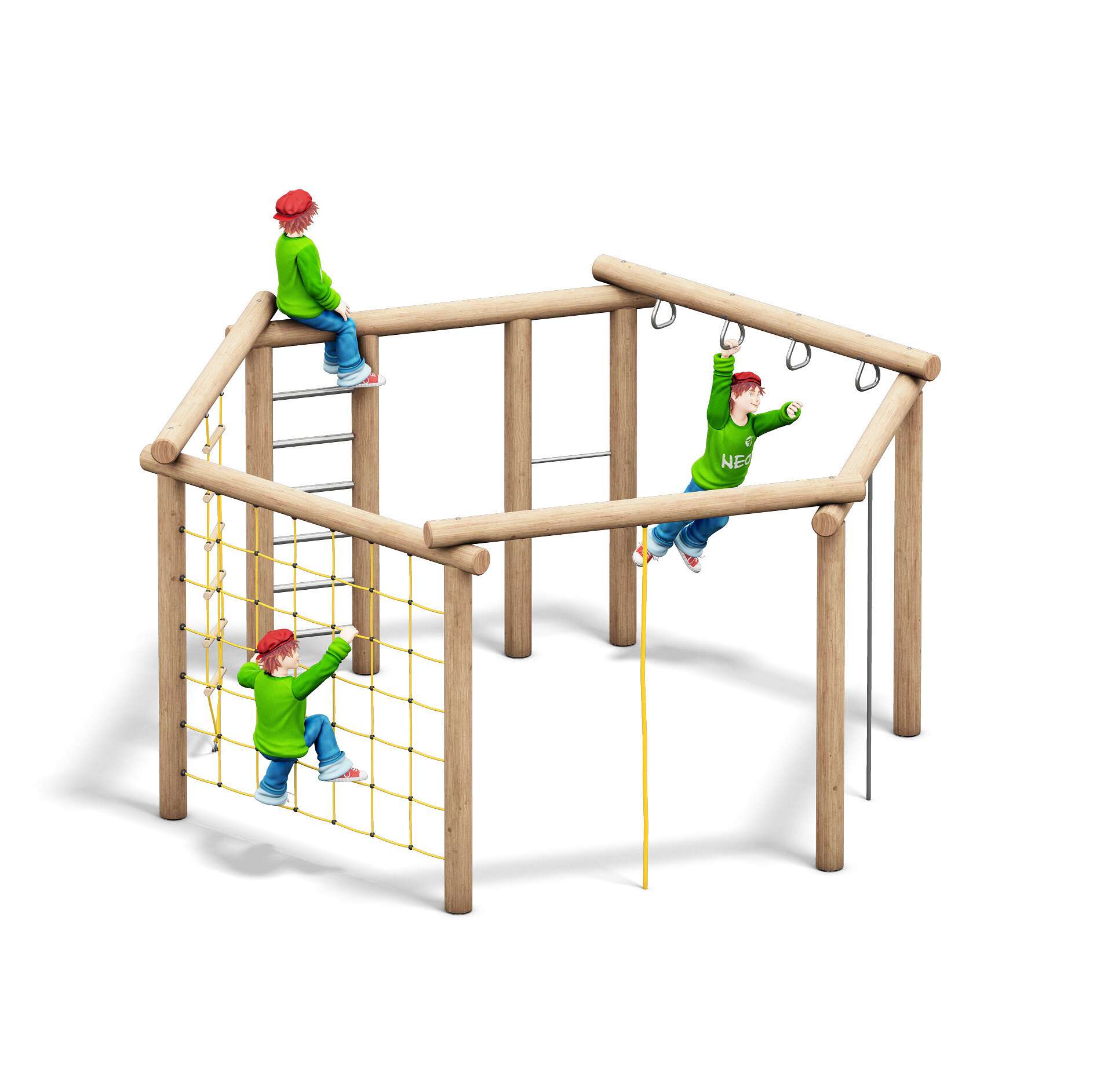| Design-Merkmale | Kombination aus Kletterturm, Rutsche und optionalen Anbauelementen wie Schaukeln oder Sandkästen (je nach Konfiguration). Die Module sind so angeordnet, dass sie verschiedene Schwierigkeitsgrade beim Klettern und Erkunden bieten. Die Höhe und die Abstände der Sprossen sind ergonomisch gestaltet, um Kindern einen sicheren Auf- und Abstieg zu ermöglichen. |