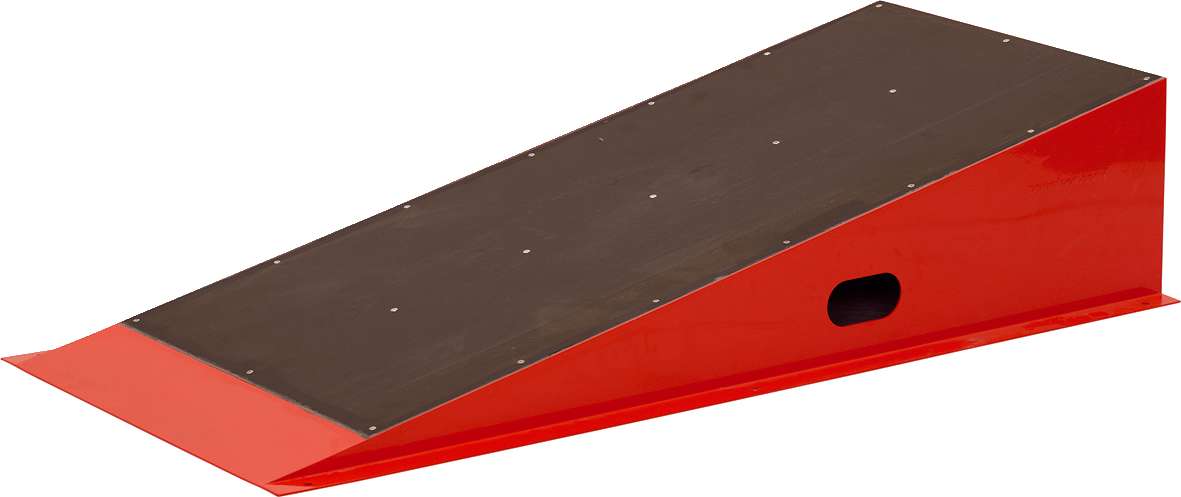 Die Rampe verfügt über integrierte rutschhemmende Elemente an der Unterseite, die für einen sicheren Stand auf verschiedenen Oberflächen wie Asphalt, Beton oder Gitterrosten sorgen und ein Verrutschen während der Nutzung verhindern.