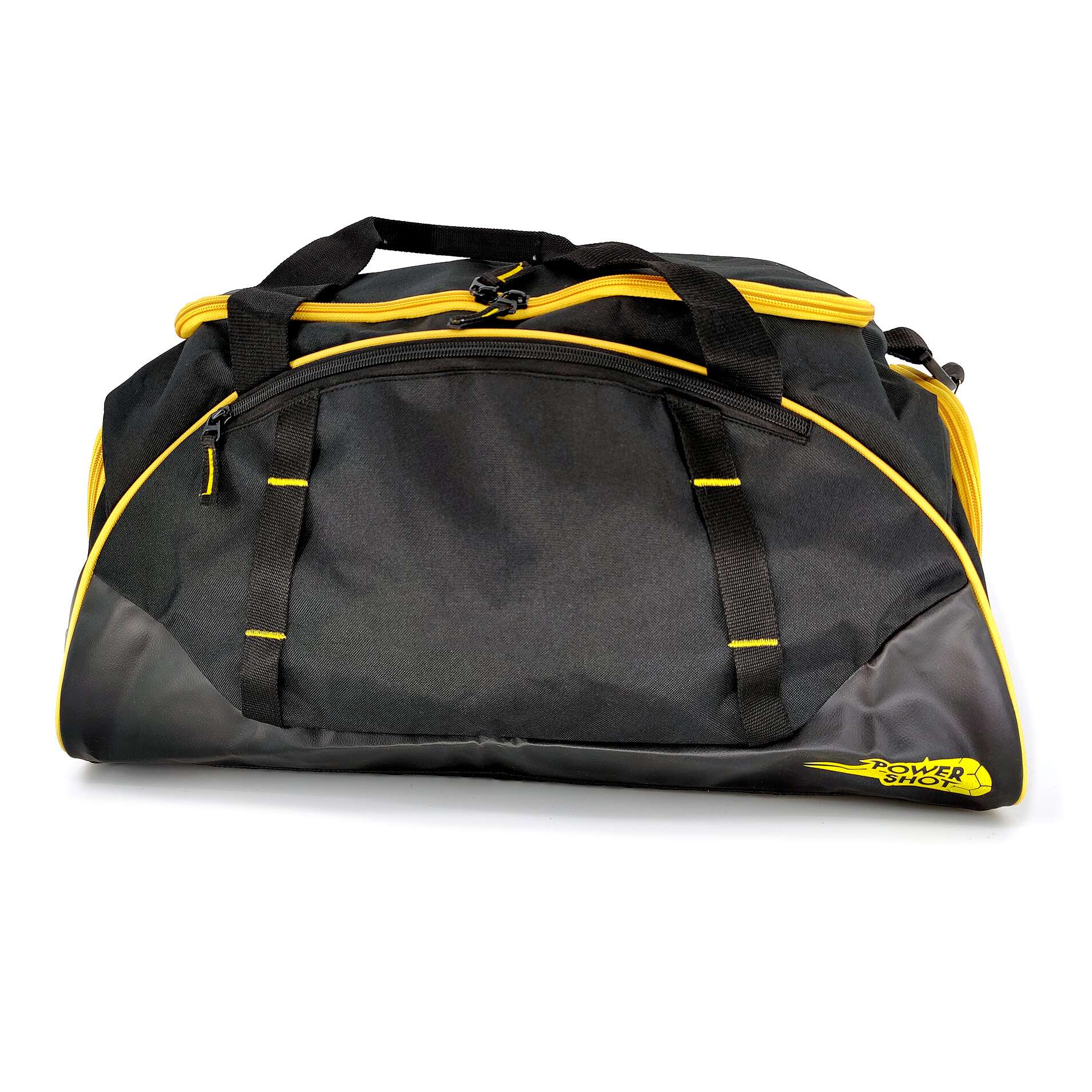 | Design-Merkmale | Klassische Längsbauweise mit einem großen Hauptfach. Ein seitlich angebrachtes, belüftetes Schuhfach mit Reißverschluss. Eine Fronttasche mit Reißverschluss für schnellen Zugriff auf wichtige Utensilien. Innenliegende Steckfächer zur besseren Organisation. Stabile, ergonomisch geformte Handgriffe und ein abnehmbarer, längenverstellbarer Schultergurt mit Polster. Subtil integriertes Powershot-Logo. |