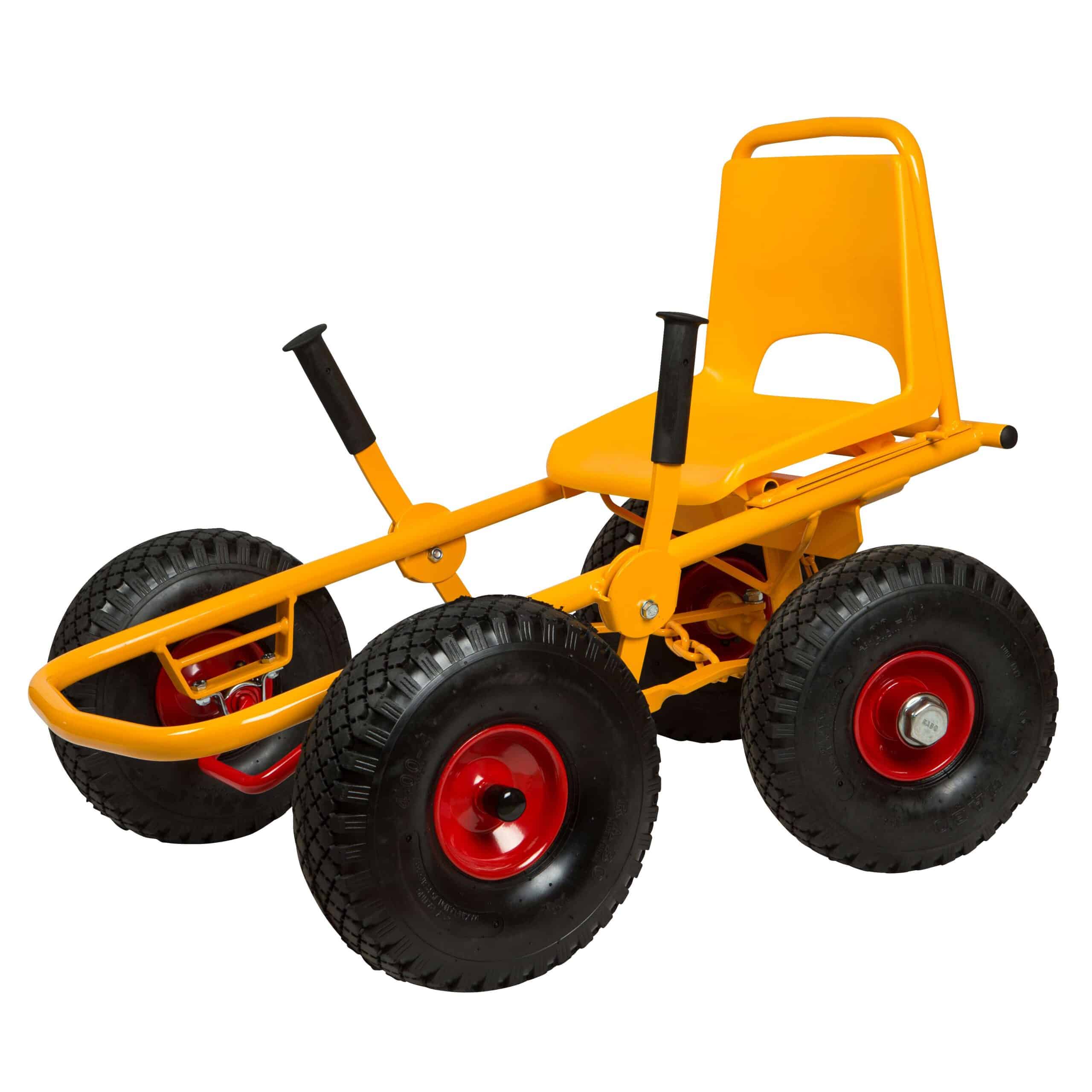 Das „Moon-Car“ ist mit robusten Kunststoffrädern ausgestattet, die für verschiedene Untergründe wie Asphalt, Beton oder kurzrasige Wiesen geeignet sind. Sie bieten gute Traktion und Laufruhe.