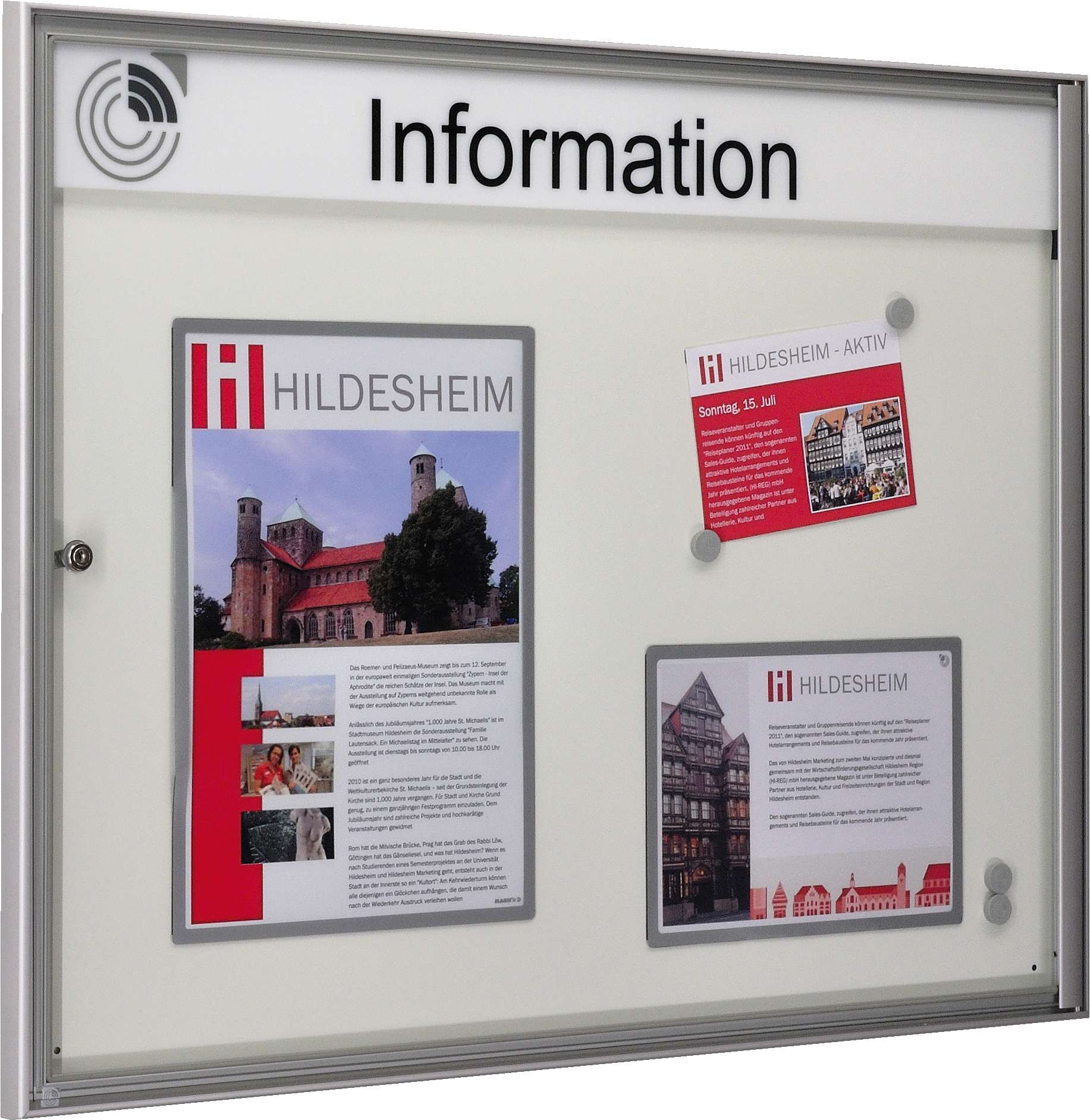 Aufgrund der Tiefe von 27 mm eignet sich der Schaukasten für die Präsentation von flachen Objekten wie gerahmten Bildern, Zertifikaten, wichtigen Mitteilungen, Karten oder auch dreidimensionalen Objekten mit moderatem Volumen.
