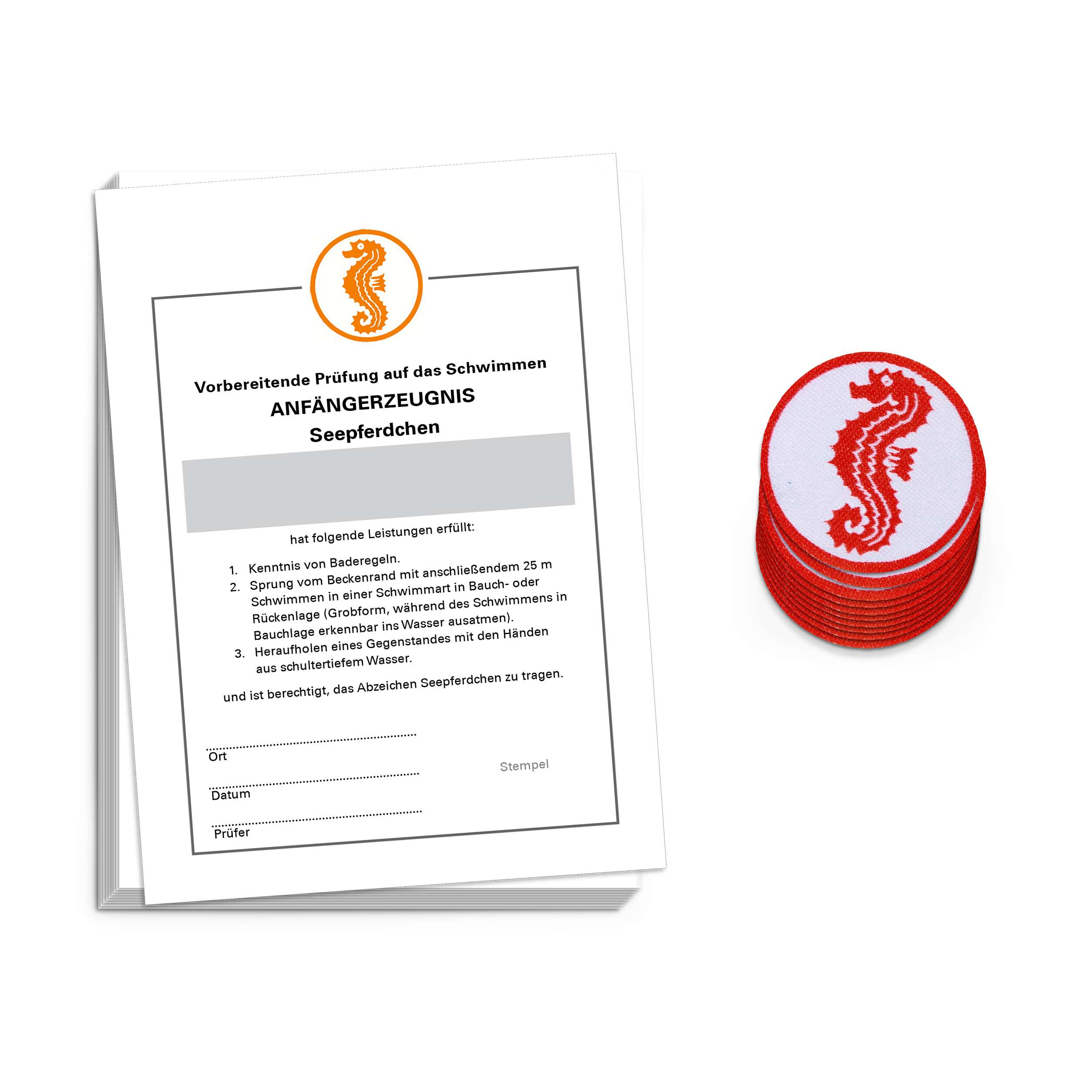 - Ein offizielles Seepferdchen-Zeugnis, das die erbrachten Leistungen dokumentiert und vom Ausbilder unterschrieben werden kann.