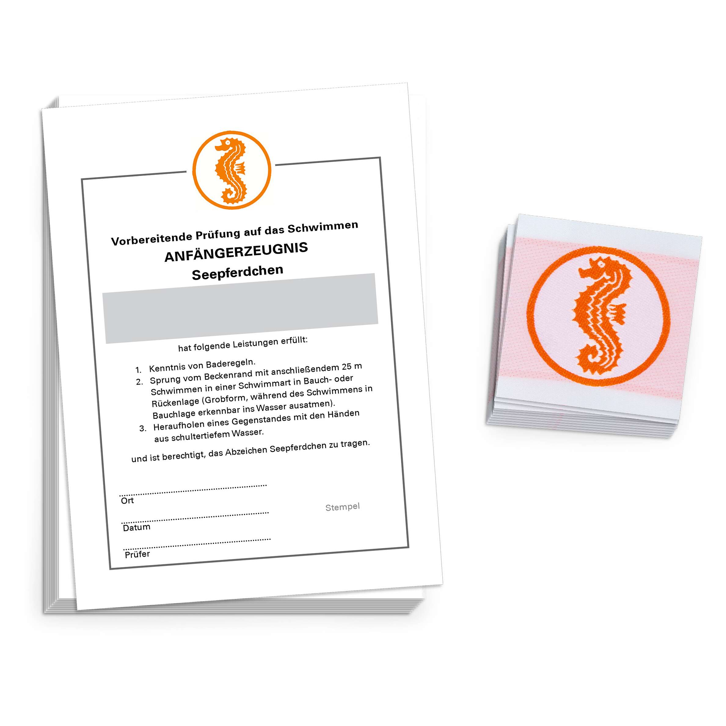 - Ein offizielles „Seepferdchen“-Abzeichen, zum direkten Aufnähen konzipiert.