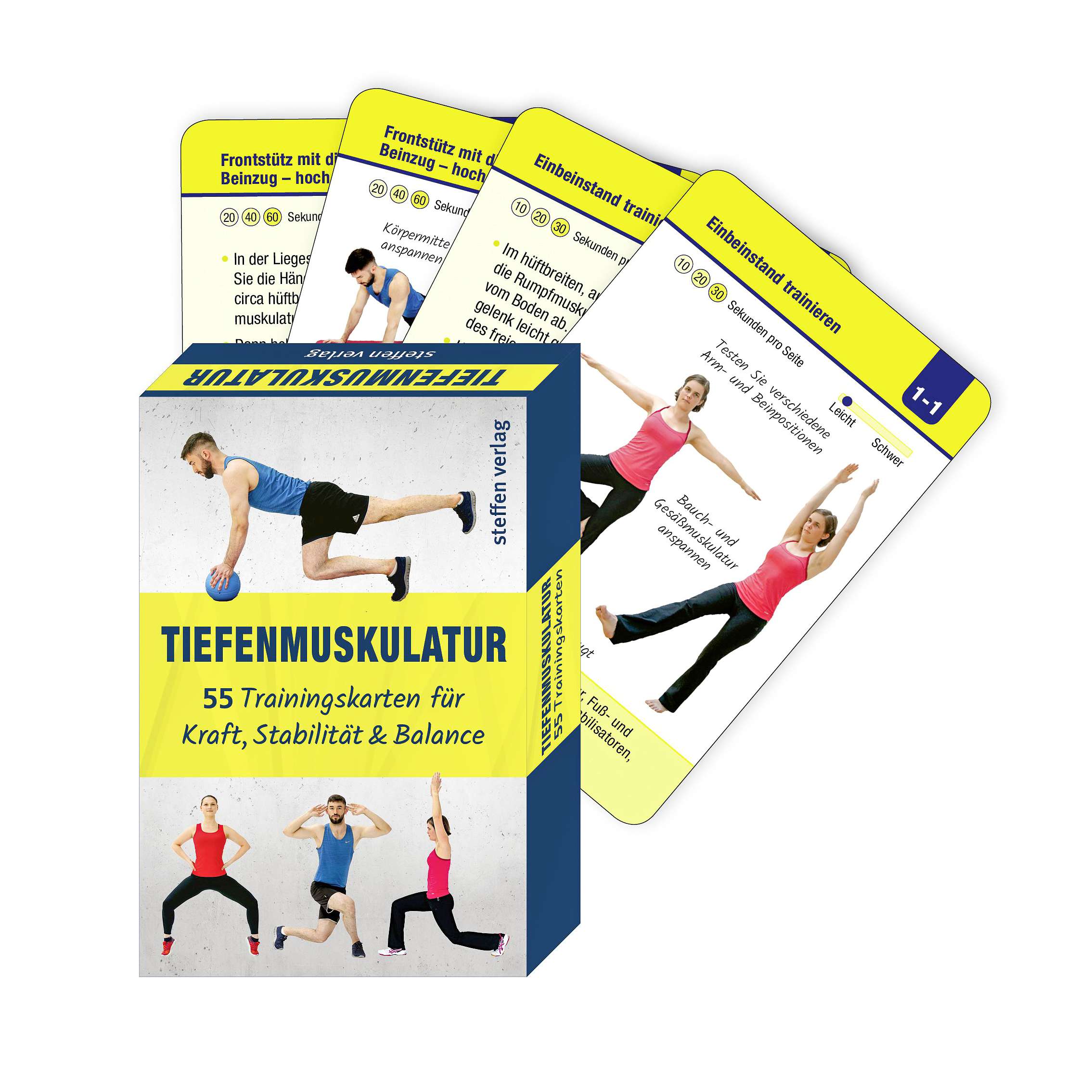 | Inhalt | Umfangreiche Sammlung von Übungskarten zur gezielten Kräftigung der Tiefenmuskulatur. Jede Karte präsentiert eine spezifische Übung mit detaillierter Anleitung und visueller Darstellung. |