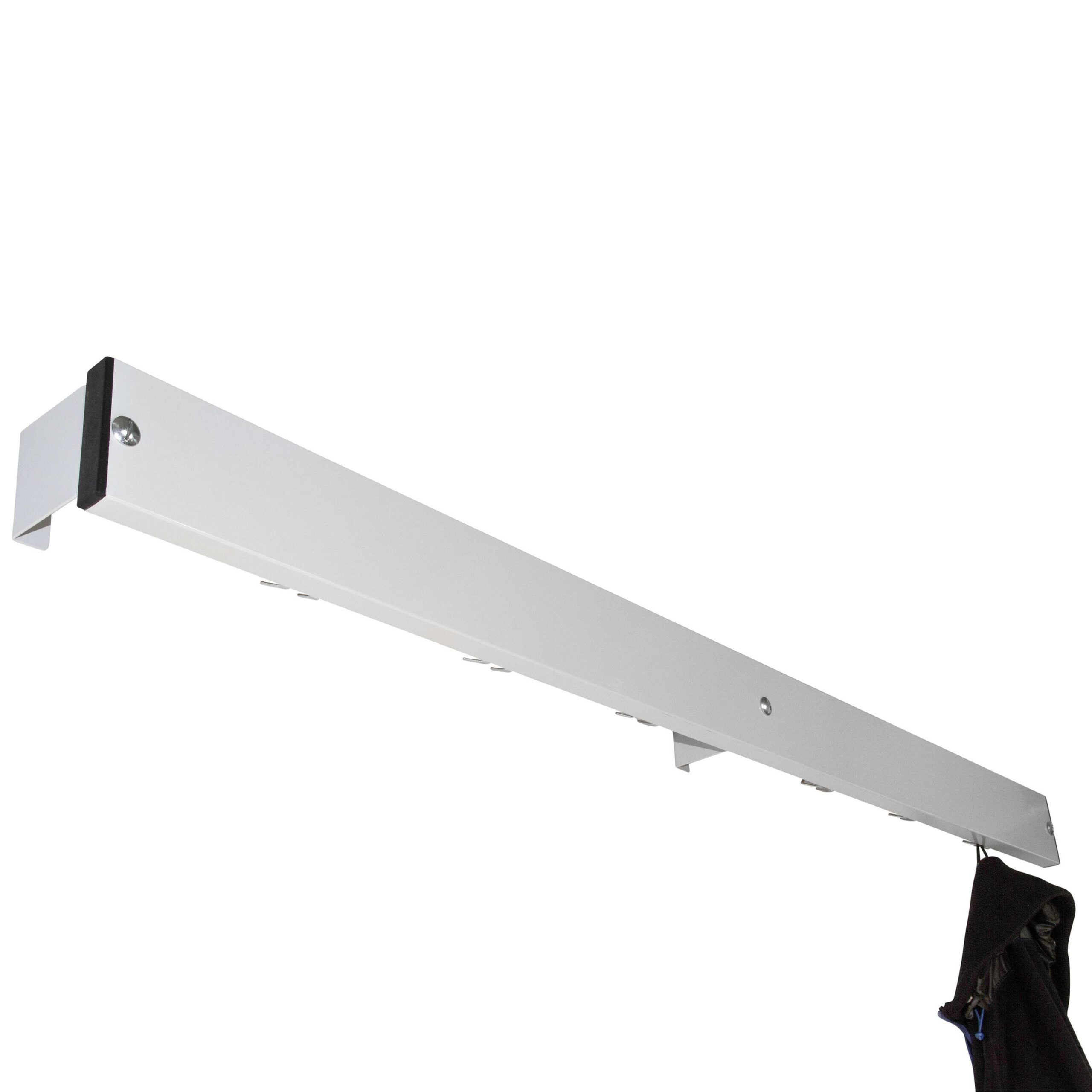 Neben ihrer überragenden Funktionalität überzeugt die Sypro Garderobenleiste auch durch ihr dezentes und modernes Design. Das Lichtgrau (RAL 7035) ist eine klassische und zeitlose Farbe, die sich nahtlos in unterschiedlichste Interieurs einfügt, von minimalistisch bis hin zu eher klassischen Umgebungen. Die klaren Linien und die gleichmäßige Farbgebung verleihen jedem Raum eine aufgeräumte und professionelle Optik. Die Leiste ist so gestaltet, dass sie trotz ihrer Robustheit nicht wuchtig wirkt, sondern eine elegante Lösung für die Aufbewahrung bietet. Sie ist so konzipiert, dass sie auch bei voller Beladung ihre Form behält und eine stabile und ansprechende Präsentation Ihrer Garderobe ermöglicht.