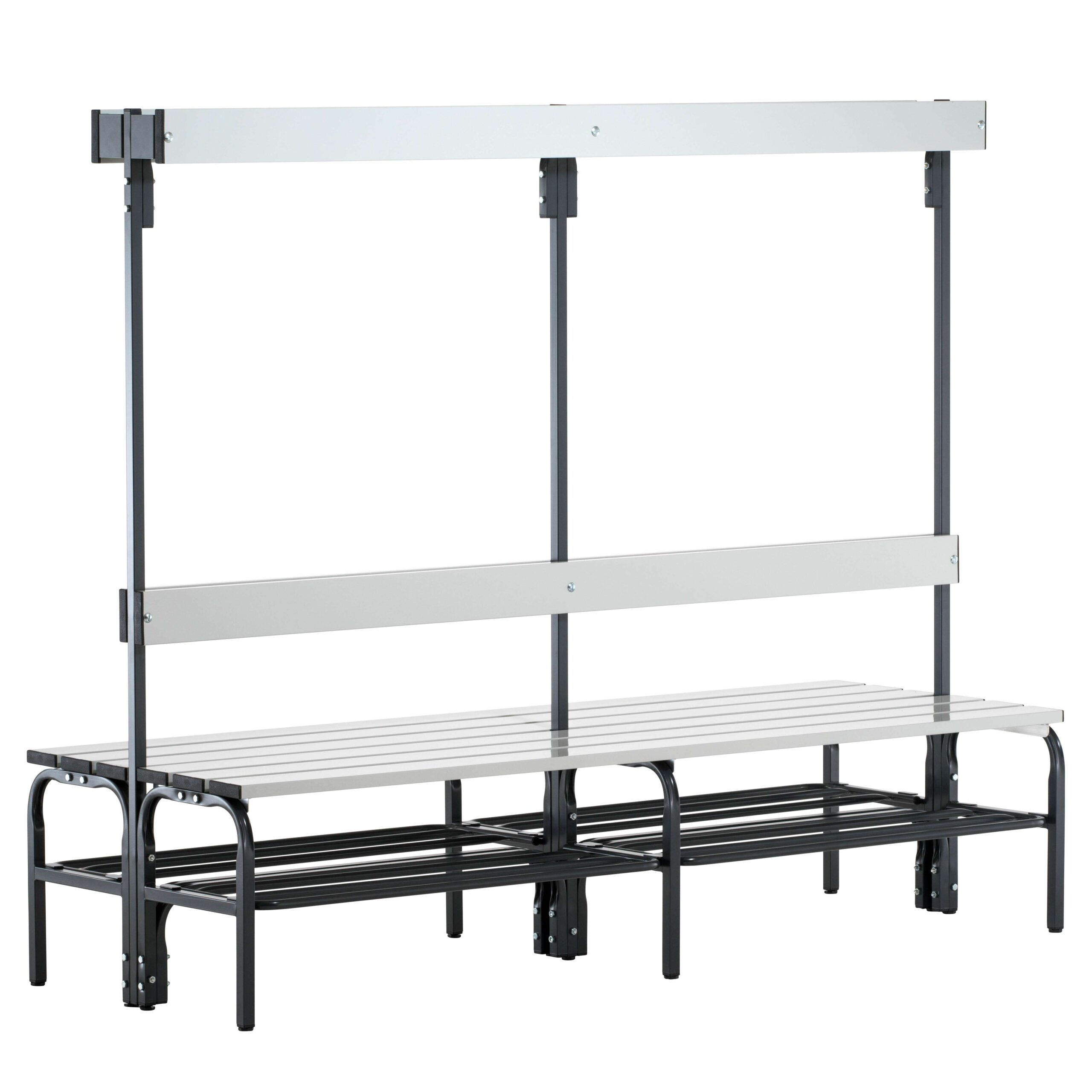 Das Design der Sypro Umkleidebank fokussiert sich auf die Bedürfnisse der Nutzer und die praktische Anwendung im täglichen Betrieb. Die doppelseitige Ausführung ist ein Paradebeispiel für effiziente Raumplanung in stark frequentierten Umkleidebereichen. Sie ermöglicht eine gleichzeitige Nutzung durch eine größere Anzahl von Personen, was die Durchlaufzeiten verkürzt und Engpässe vermeidet. Die integrierte Rückenlehne ist ein nicht zu unterschätzender Komfortfaktor. Sie bietet den Nutzern eine angenehme Stütze während des An- und Ausziehens, was besonders geschätzt wird, wenn Personen länger auf der Bank sitzen. Die sorgfältige Formgebung mit abgerundeten Kanten reduziert das Verletzungsrisiko, ein wichtiger Aspekt in Umgebungen, wo oft Eile geboten ist. Der integrierte Schuhrost unterhalb der Sitzfläche ist eine clevere Lösung, um Ordnung zu schaffen und die Hygiene zu fördern. Er hält die Schuhe vom Boden fern, was das Reinigen des Bodens erleichtert und verhindert, dass sich dort Schmutz und Nässe ansammeln. Gleichzeitig ermöglicht der Rost eine gute Luftzirkulation, wodurch die Schuhe schneller trocknen können.