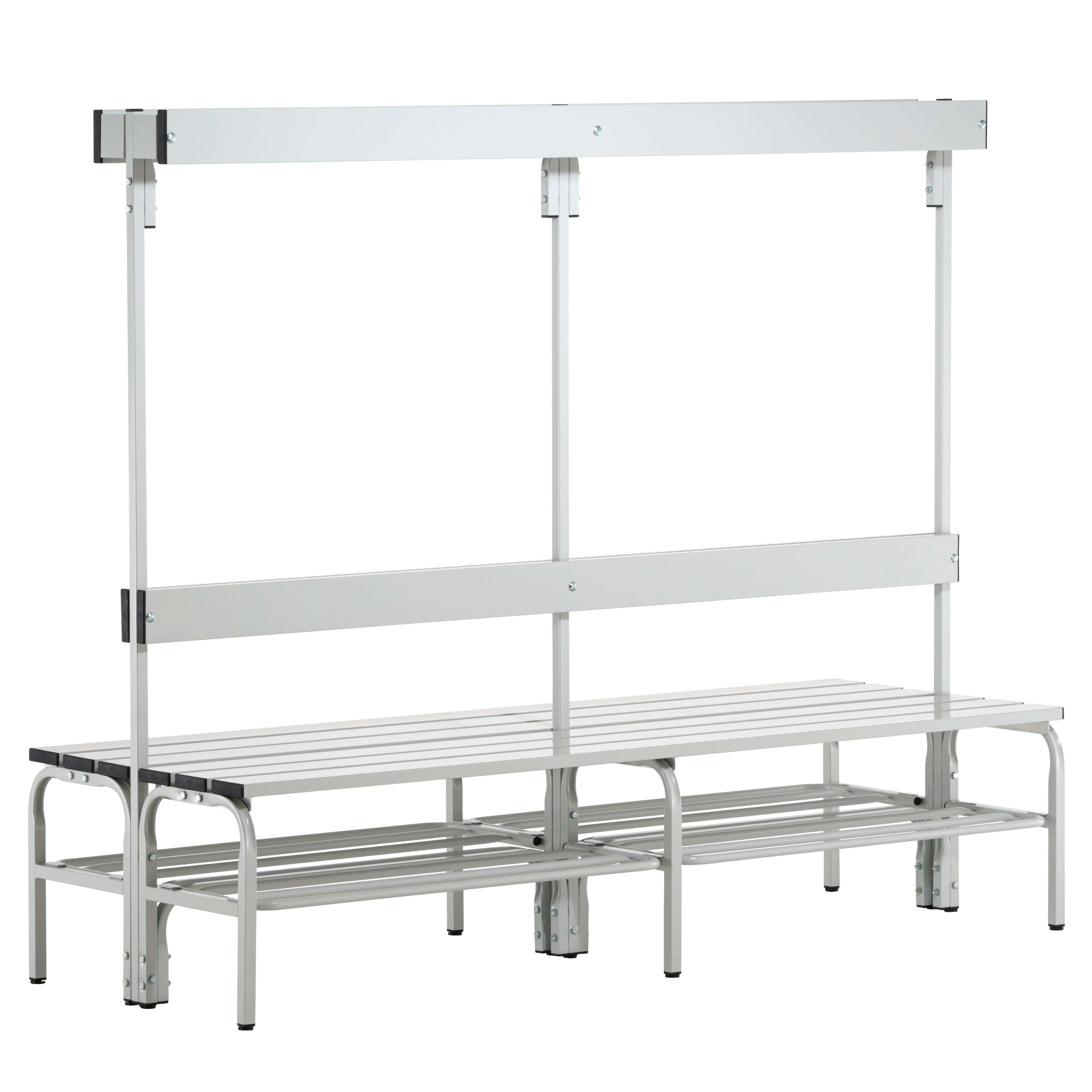 Häufig gestellte Fragen zu Sypro Umkleidebank für Feuchträume mit Rückenlehne, doppelseitig, 2,00 m, Lichtgrau (RAL 7035), Mit Schuhrost