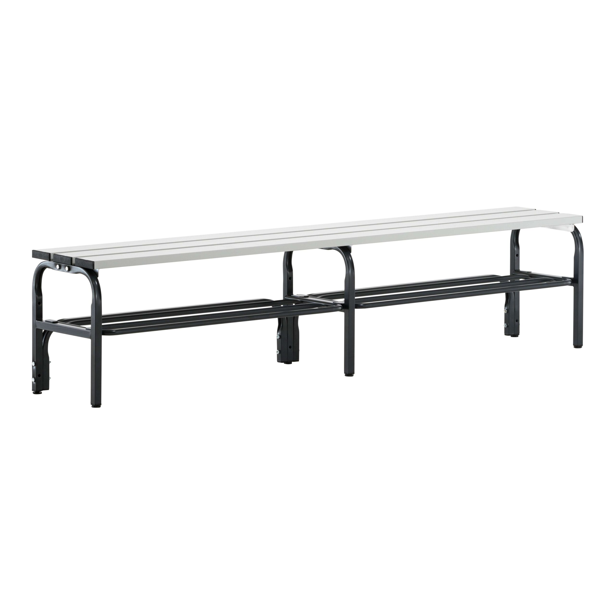 Das klare und funktionale Design der Sypro Umkleidebank fügt sich nahtlos in jede moderne Umkleideumgebung ein. Die durchdachte Konstruktion ohne Lehne maximiert den verfügbaren Platz und ermöglicht eine einfache Handhabung. Der integrierte Schuhrost ist strategisch platziert, um die Luftzirkulation zu fördern und die Trocknung von Schuhen zu unterstützen, während er gleichzeitig eine praktische Ablagefläche bietet. Die Länge von 2,00 Metern bietet ausreichend Sitzplätze für mehrere Personen gleichzeitig.