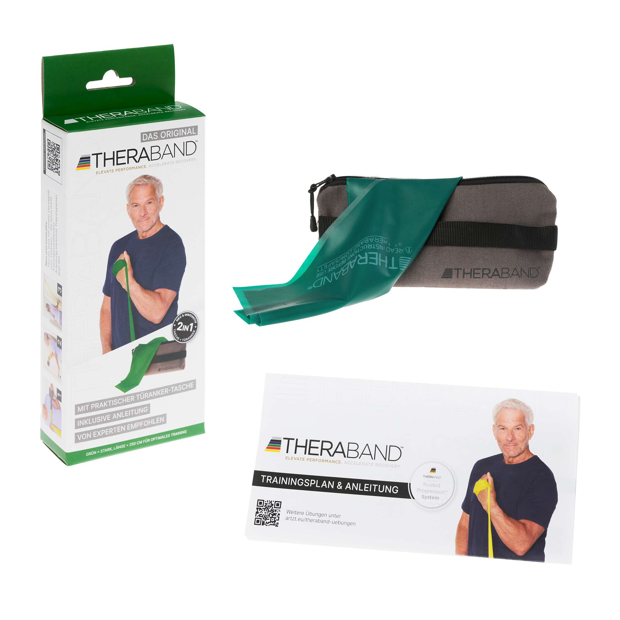 TheraBand Fitnessband 2,5 m in Reißverschlusstasche, Grün, Stark – Ihr Trainingspartner für Kraft und Flexibilität