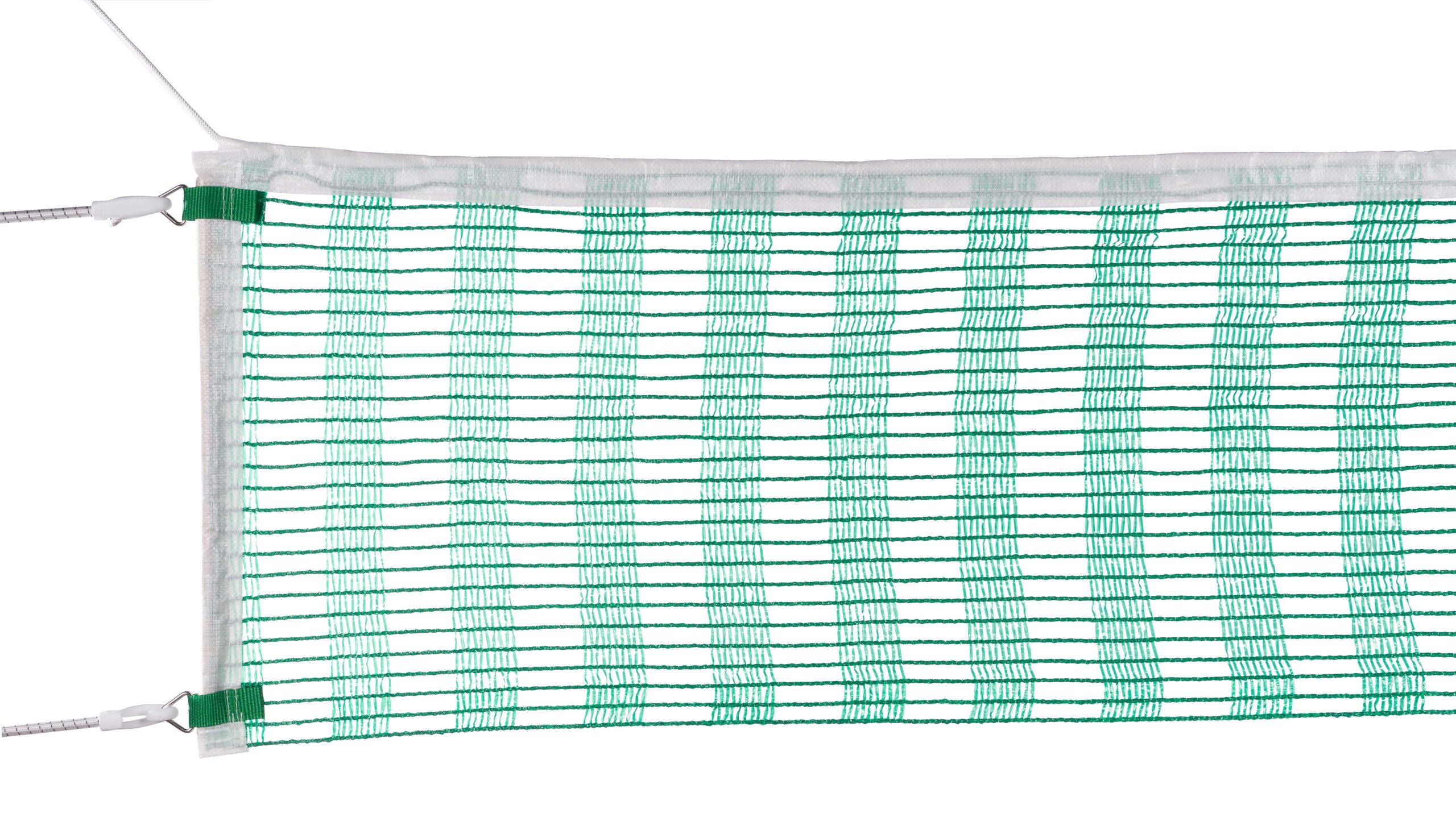 Das Volleyballnetz „Profi“ setzt auf bewährte Materialien, die eine optimale Kombination aus Belastbarkeit und Flexibilität bieten. Das Netzgewebe besteht aus hochfestem, UV-beständigem Polyethylen, das auch bei direkter Sonneneinstrahlung seine Struktur und Farbe behält. Die Maschen sind präzise geknotet, um ein Verrutschen oder Ausdehnen zu verhindern. Das obere Kopfband ist aus robustem, wetterfestem PVC gefertigt und dient zur Aufnahme der Spannseile. Die seitlichen Bänder sind ebenfalls verstärkt und mit strapazierfähigen Ösen versehen, die eine sichere Befestigung und Spannung gewährleisten.