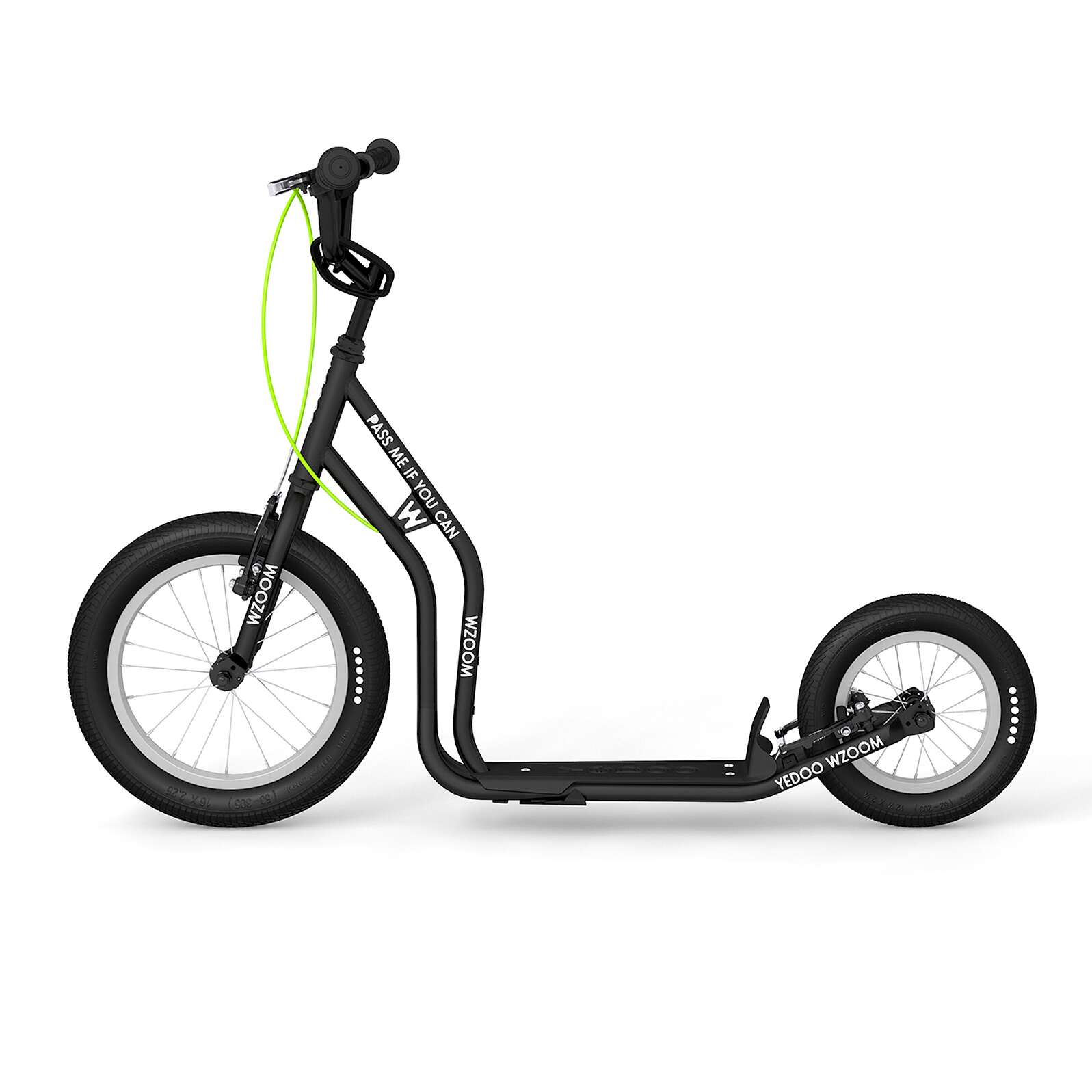 Der Yedoo Tretroller „Wzoom New“ verfügt über ein 16-Zoll-Vorderrad und ein 12-Zoll-Hinterrad. Diese unterschiedlichen Radgrößen tragen zu einer guten Laufruhe und einem angenehmen Fahrgefühl bei.